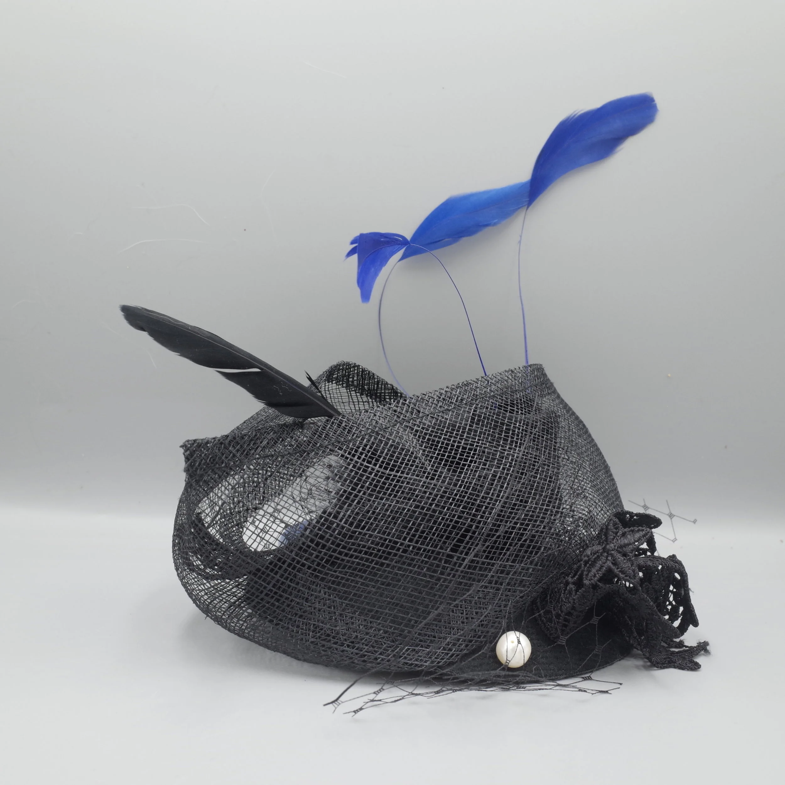 Black Blossom 黑色绽放,2017. Black cotton fascinator from Fujian; black sinamay cut from London; black lace from New York; pearls as gift from Hansi Liao; blue ostrich feather from North Carolina.