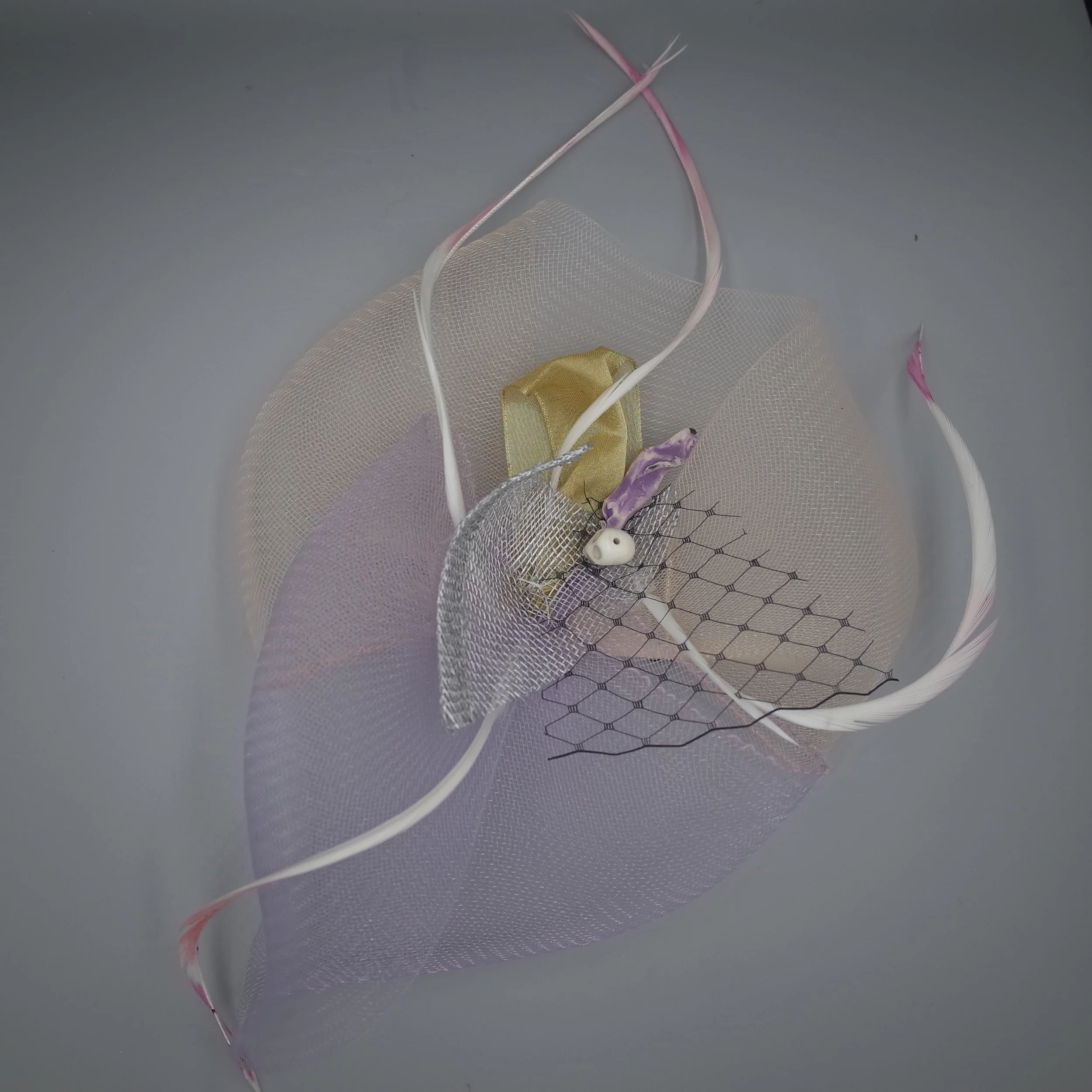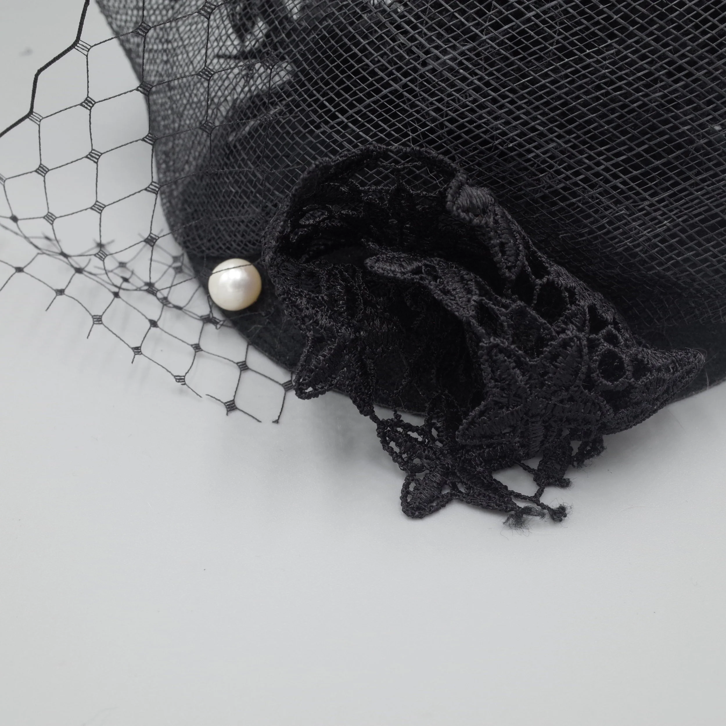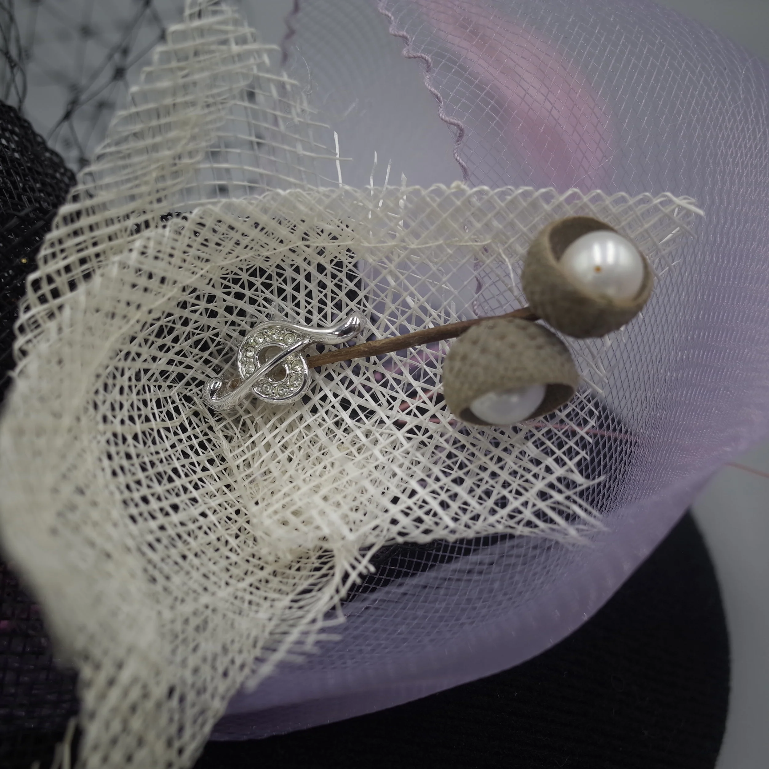 Symphony 交响乐, 2017. Black round fasicnator from Fujian; pink crin from London; ivory sinamay trim from London; black plain veiling from North Carolina; hazelnut shell founded in New York; pearl as a gift from Hansi Liao.