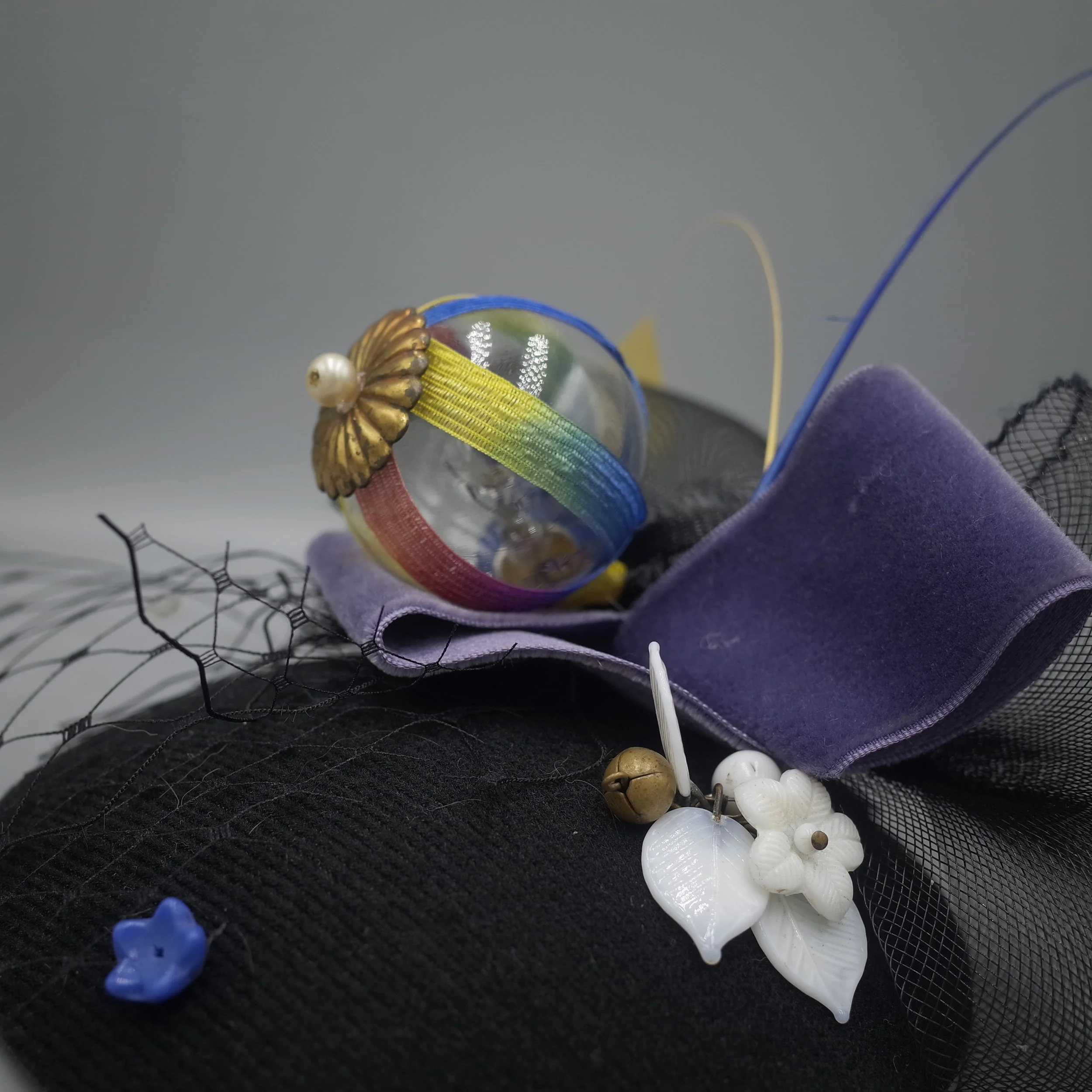 Lantern Festival 灯节, 2017. Black round fascinator base from Fujian; black plain crin from London; a light bulb; vintage silk ribbon from artist Morgan O'Hara; vintage Japanese ornaments from Morgan O'Hara; blue and yellow feather from North Carolina; black veiling from London.