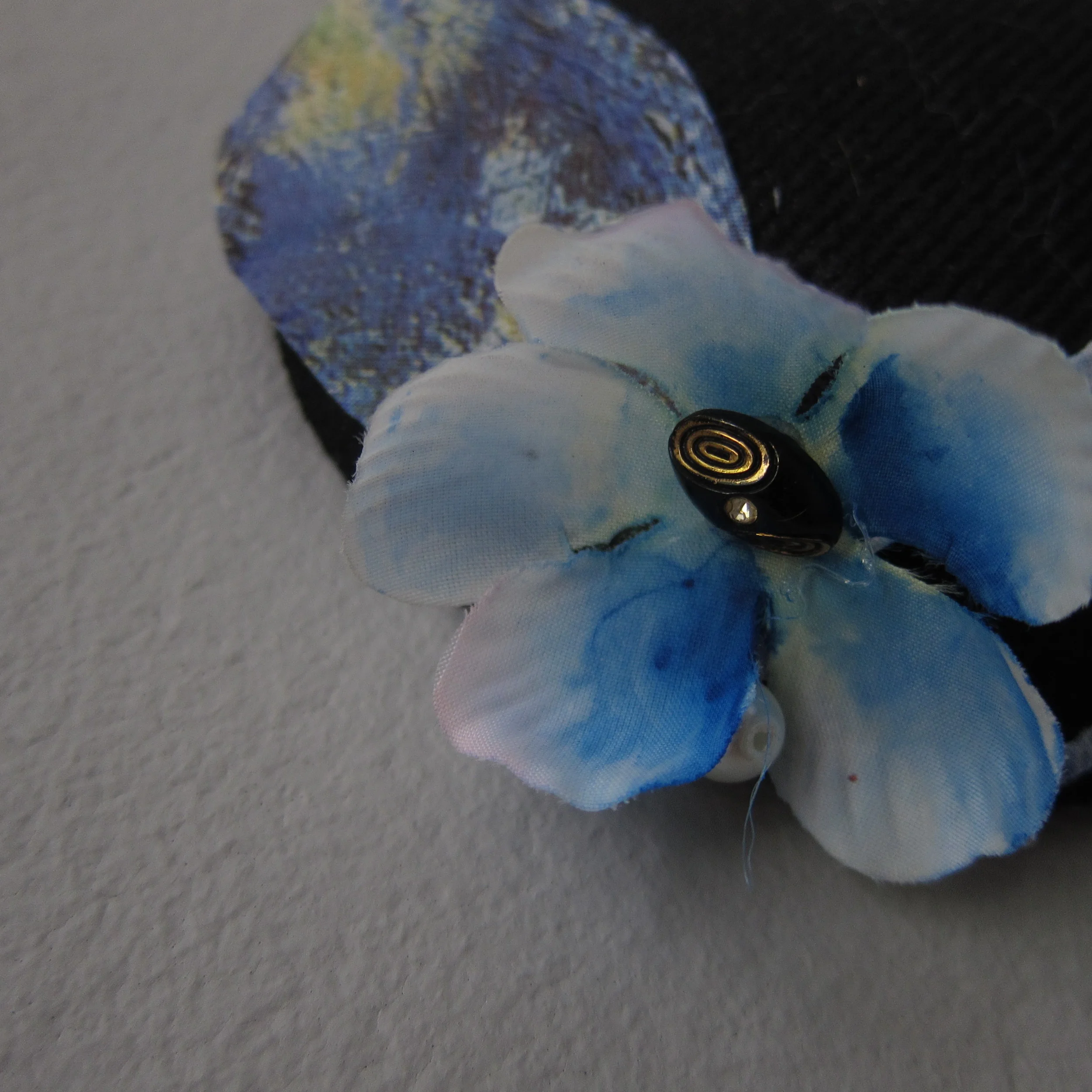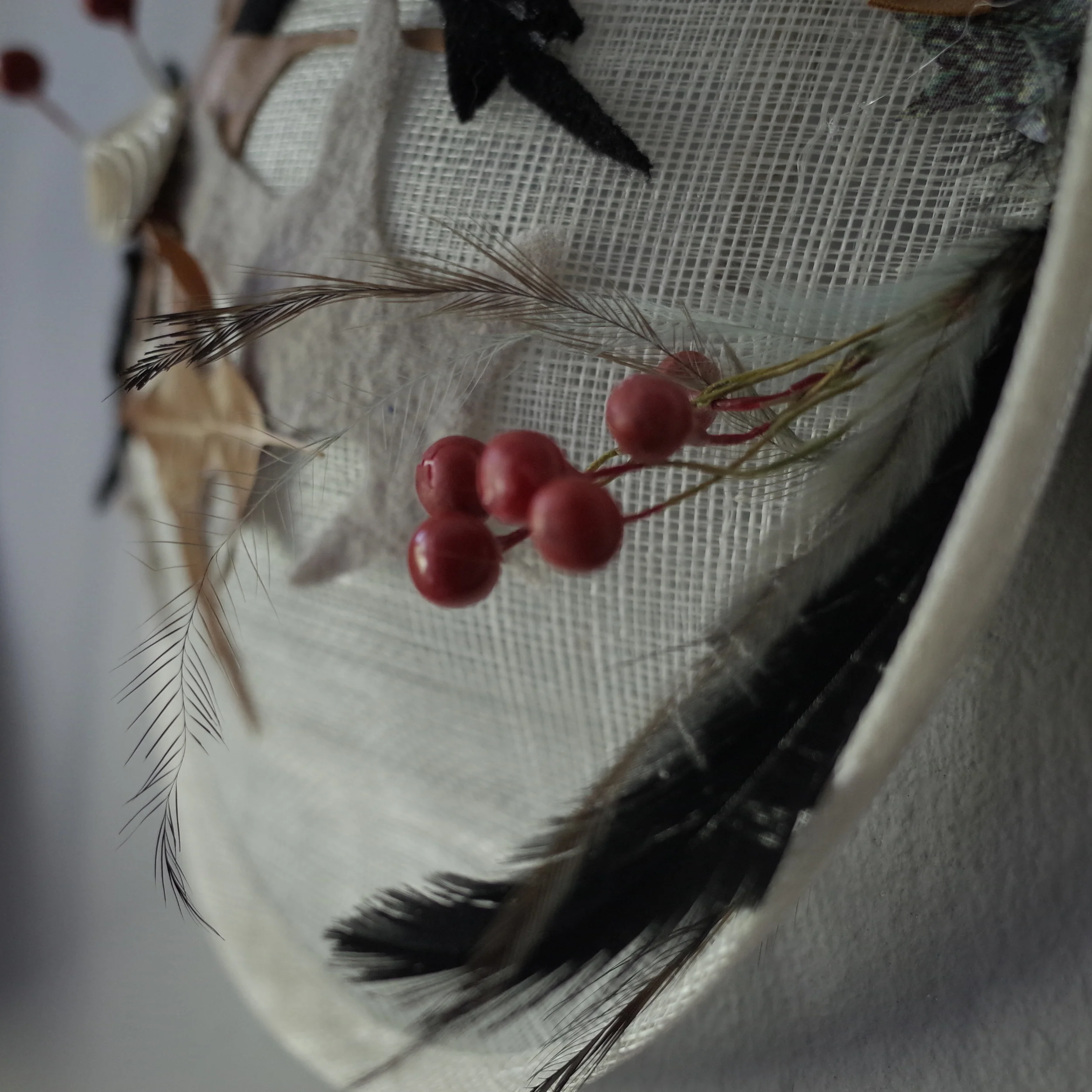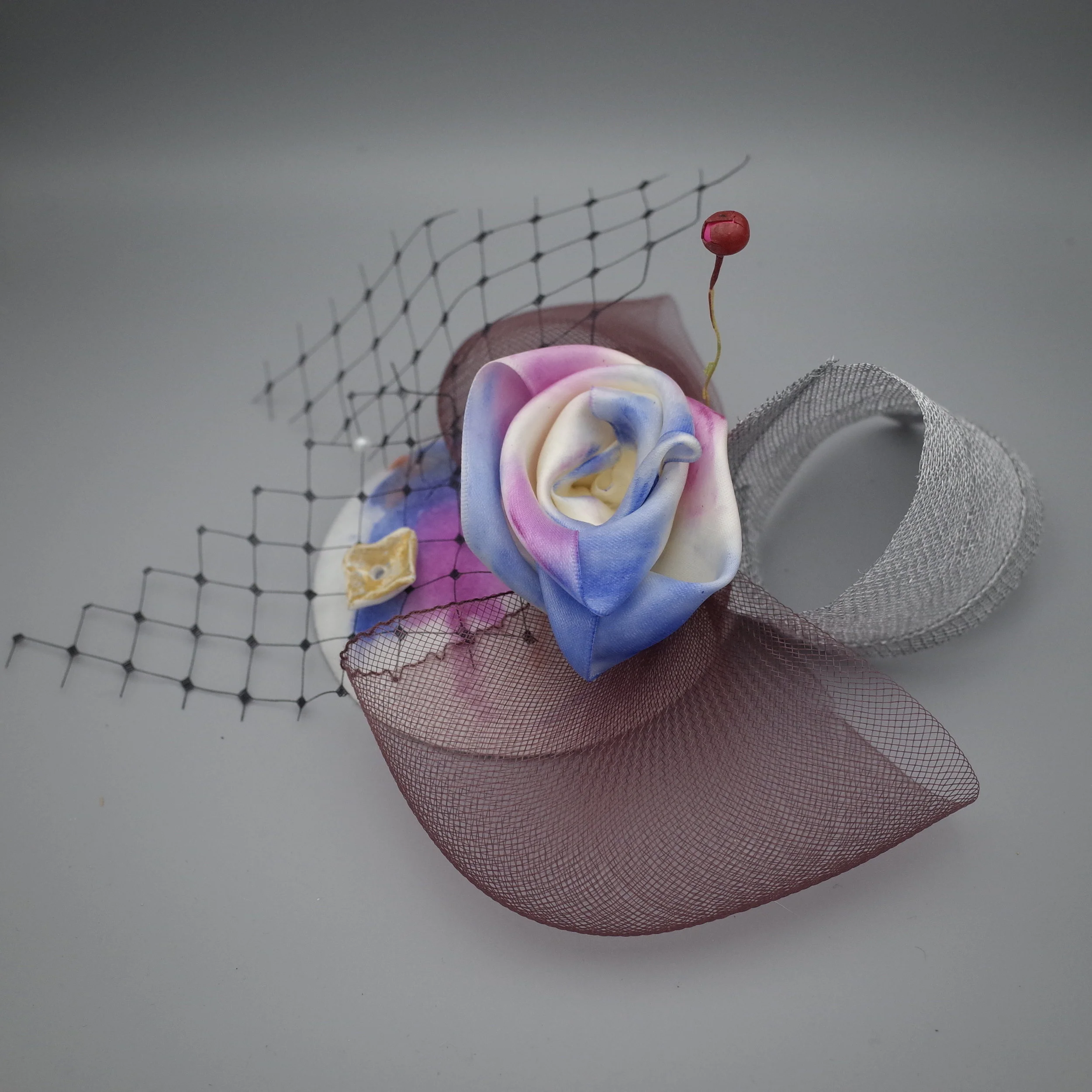 Gilles 小丑吉儿, 2016. Black cotton fascinator base from Fujian; handpainted silk fascinator base; vintage brooch from Manling; pearl ivory veiling from London; grey and blue sinamay trim from London.