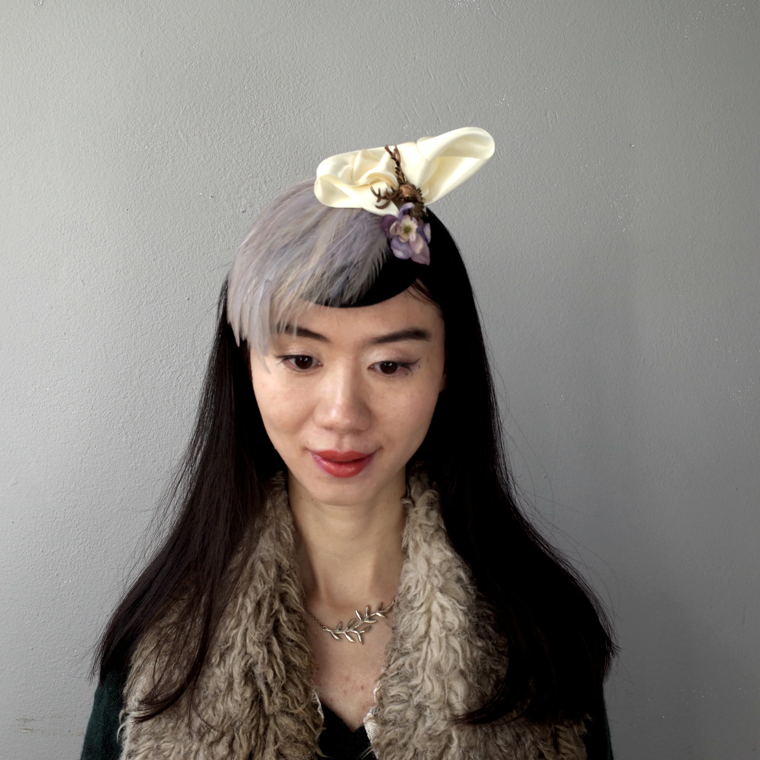 Iris Garden 鸢尾花园, 2015. Hand painted cotton fascinator base; irovy sinamay from London; white loose feather from London; vintage irises from an Iranian bookstore in Boston; hand painted silk ribbon from New York.