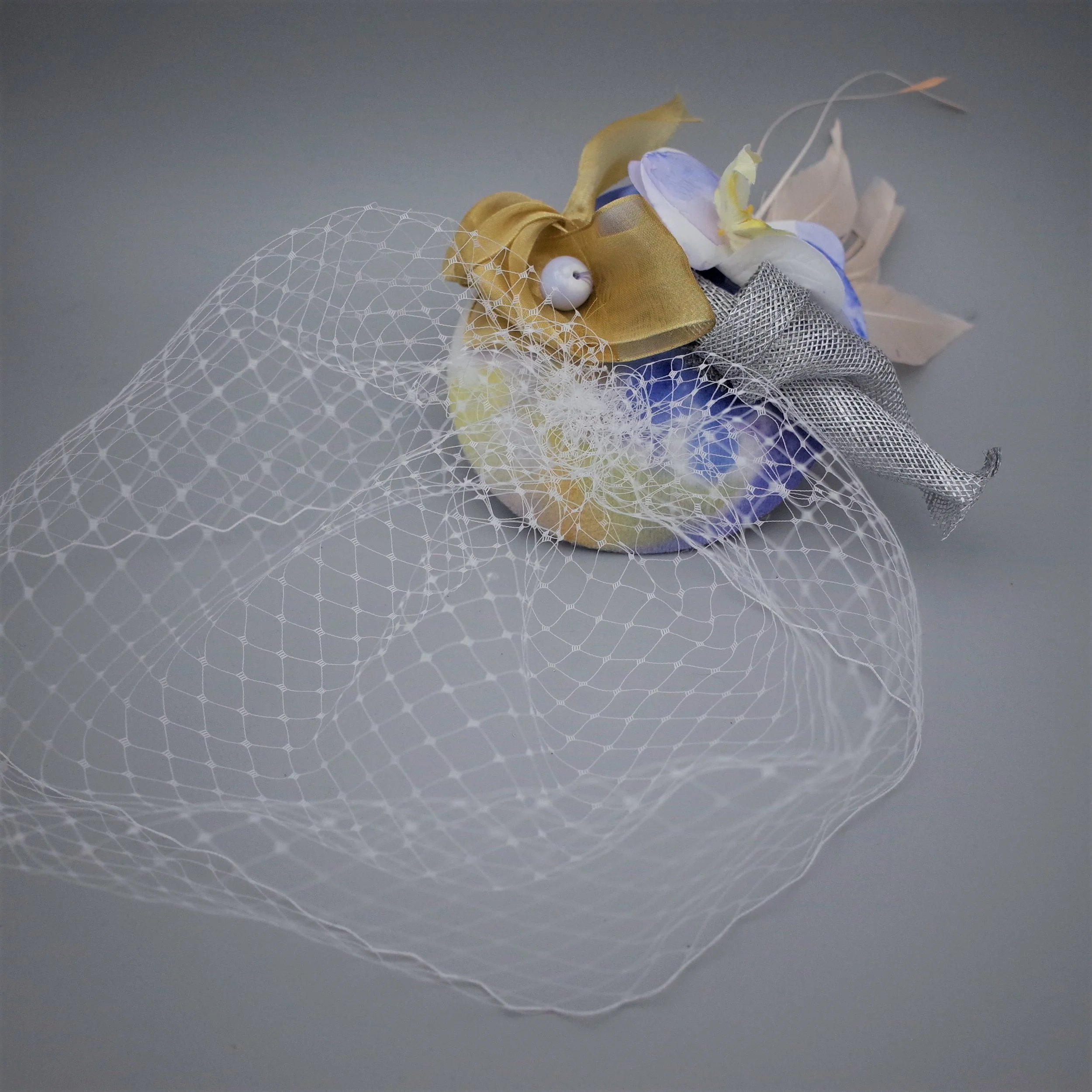 Montevideo 蒙得维的亚, 2017. Hand painted sinamay round fascinator base from London; ivory veiling from London; silver veiling from London; ivory mesh from New York; shining golden yarn from New York; a vintage flower brooch from East Village, New York.