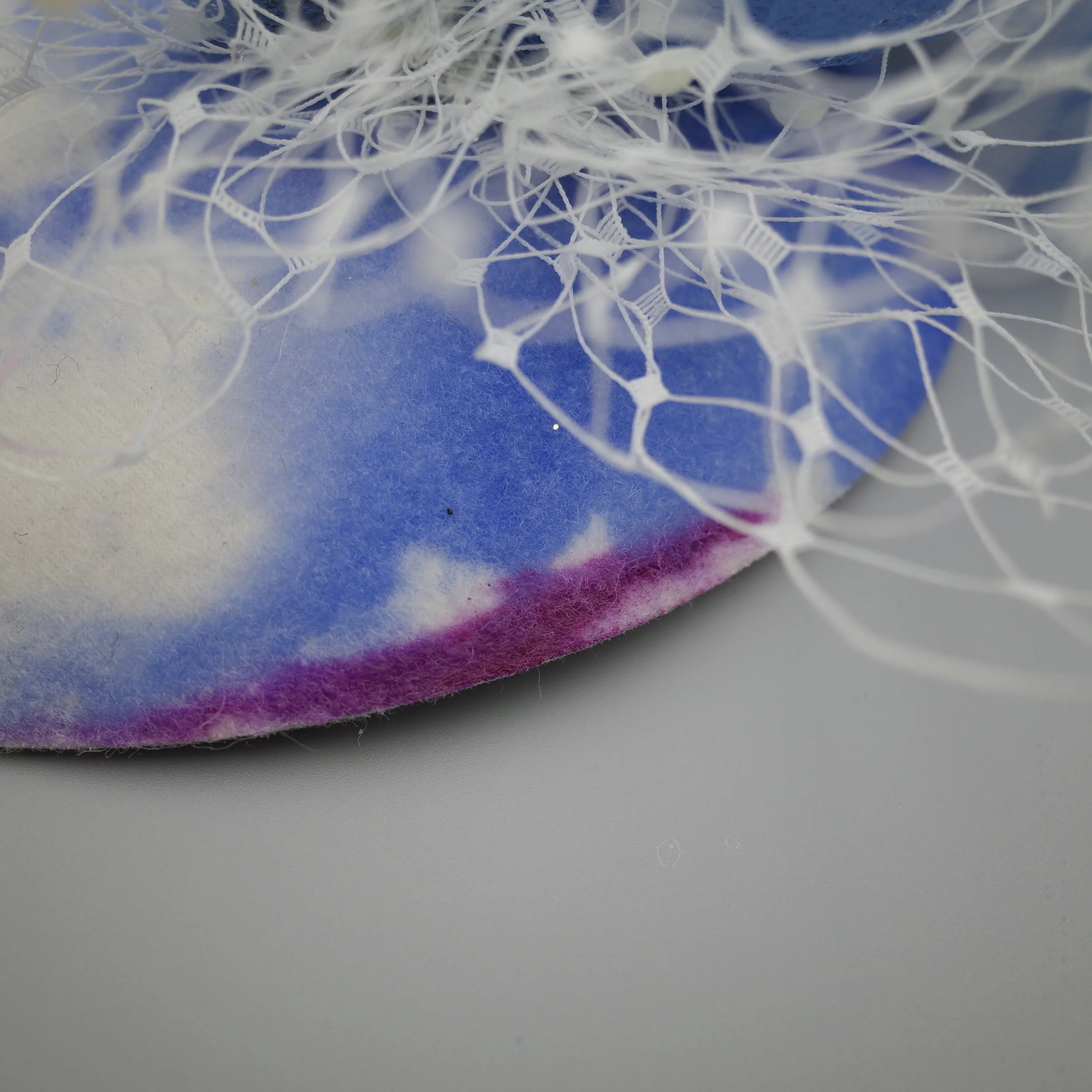 Blue Mountain 蓝山, 2016. 2 Hand-painted sinamay fascinator base from London; fabrics from a broken Monet's Pond umbrella; ivory ostrich feather from London; ivory shining yarn from Brooklyn;