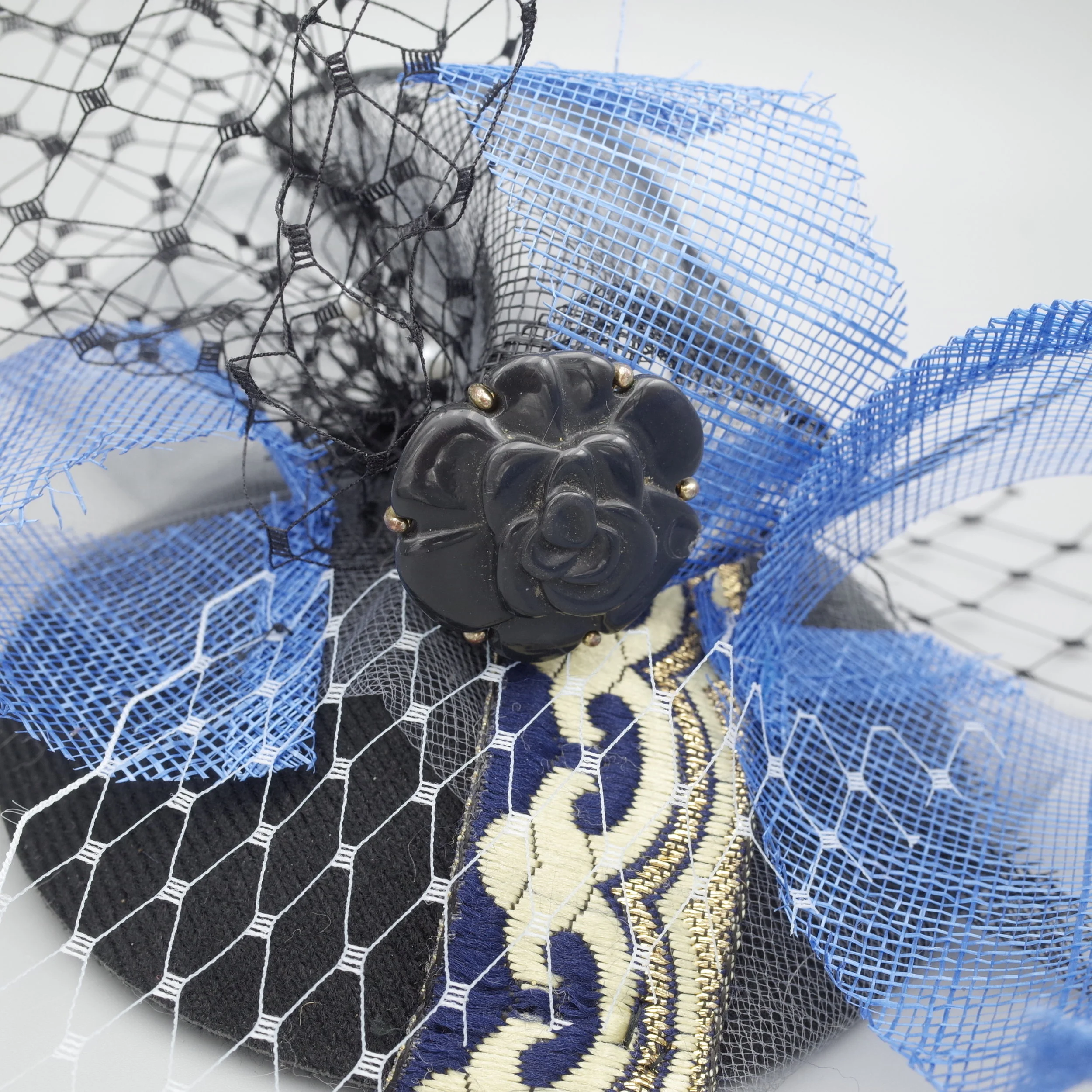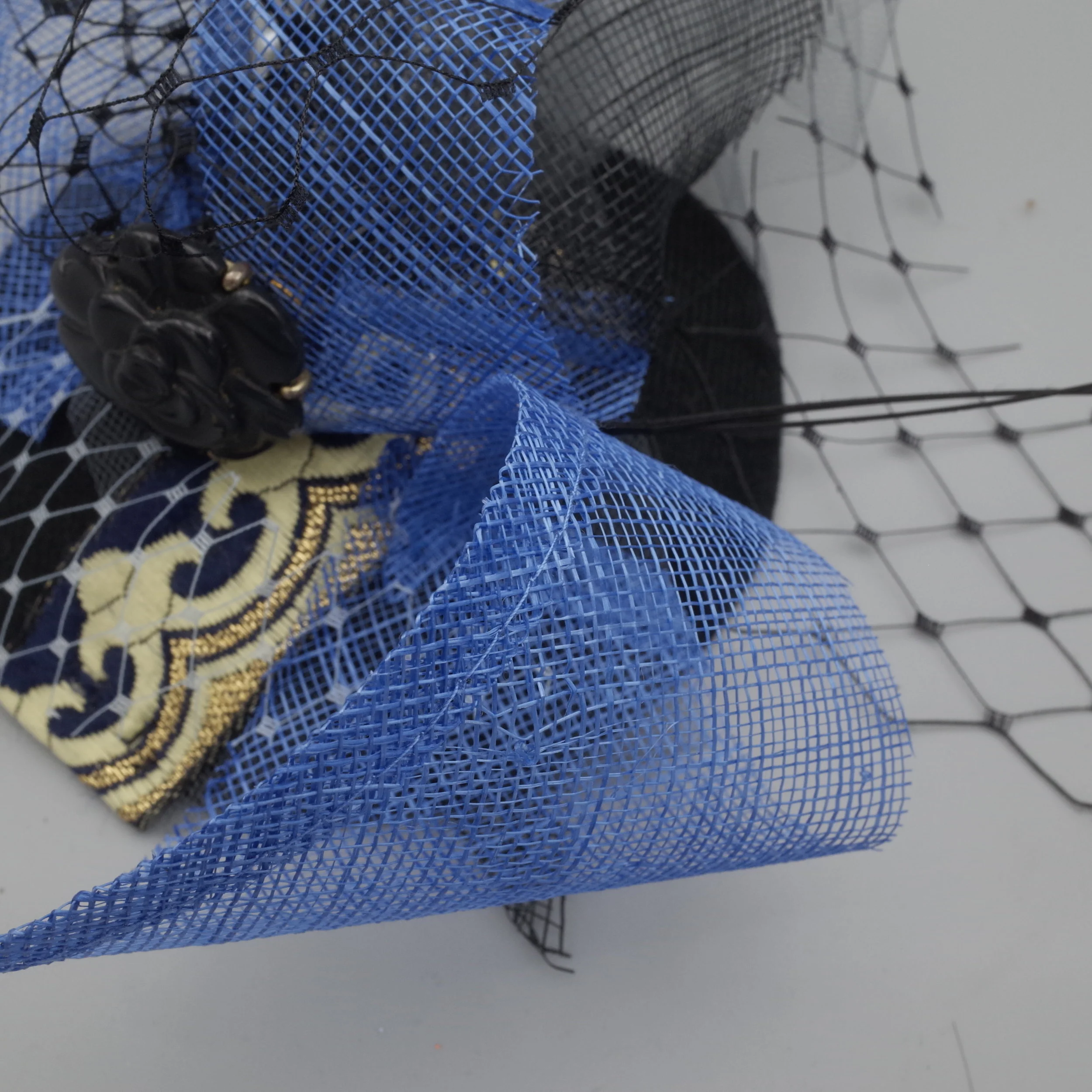 Ultra Marine II 海之蓝 II,2017. Black cotton fascinator base from Fujian; black and blue sinamay trim from London; black ostrich feather from London; black plain veiling from London; a vintage rose ear clip as a gift from Helene Hipstadt