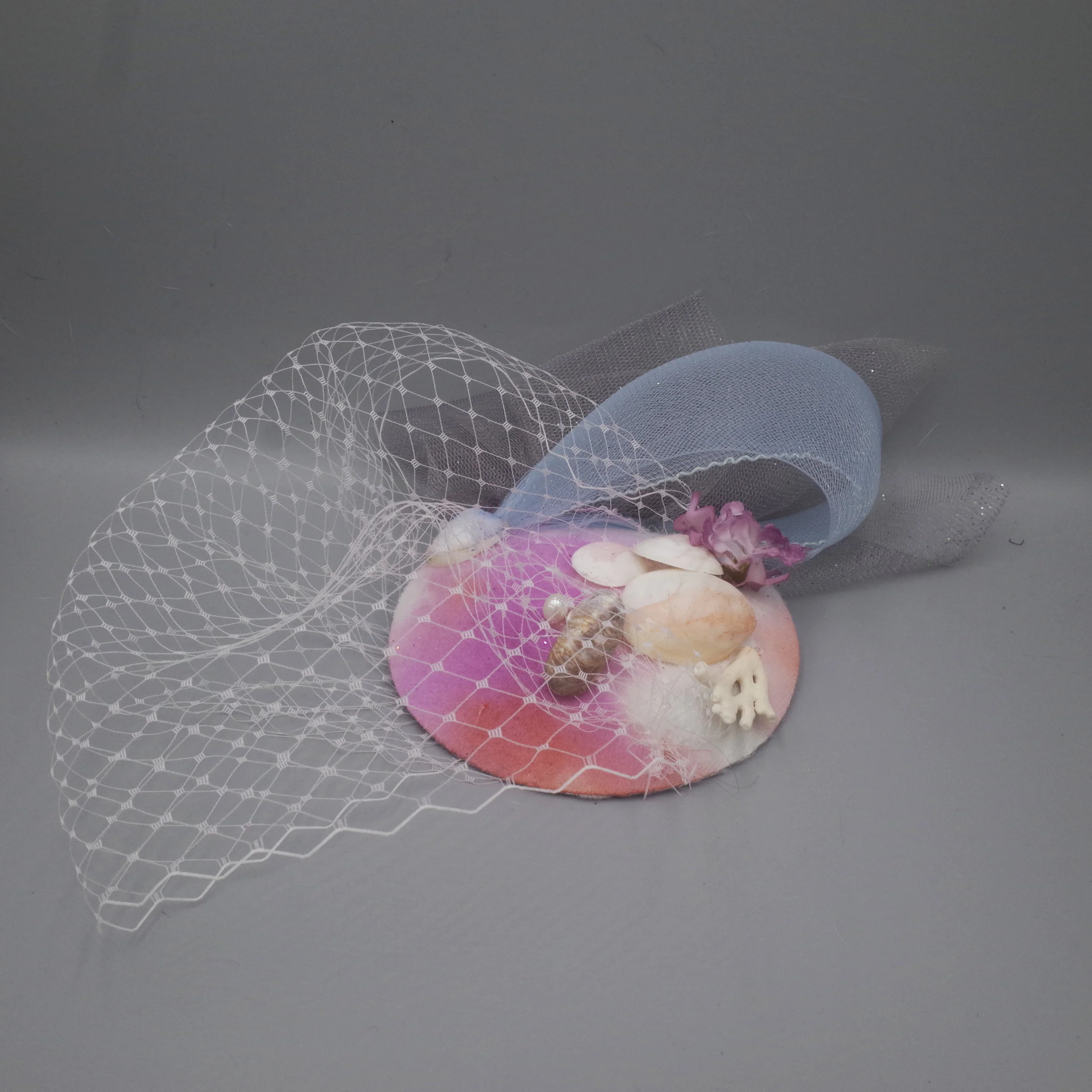 Pink Beach 粉红海滩, 2017. Hand painted fascinator base; cornflower blue crin from London; ivory plain veiling from London; founded shells and conchs on the pink beach of Bahamas; vintage flower from a second hand Iranian book store in Boston.