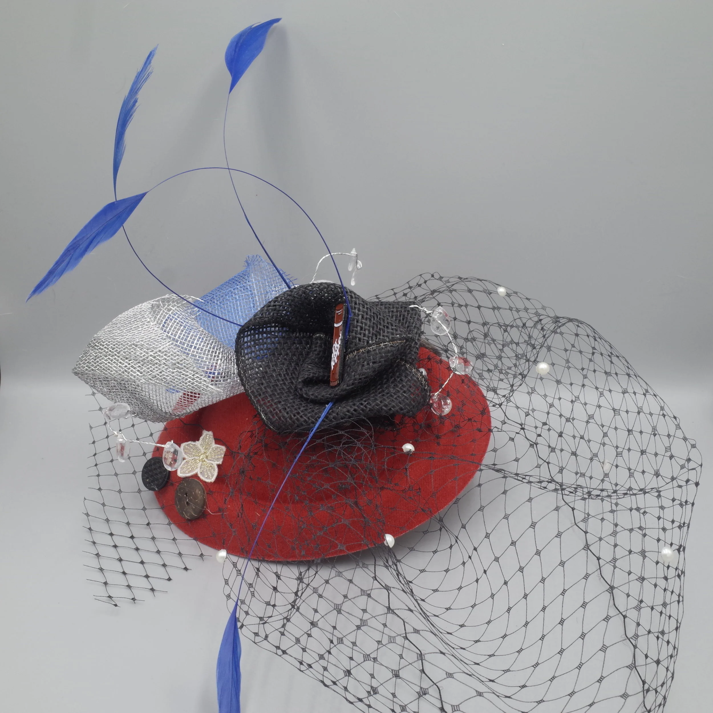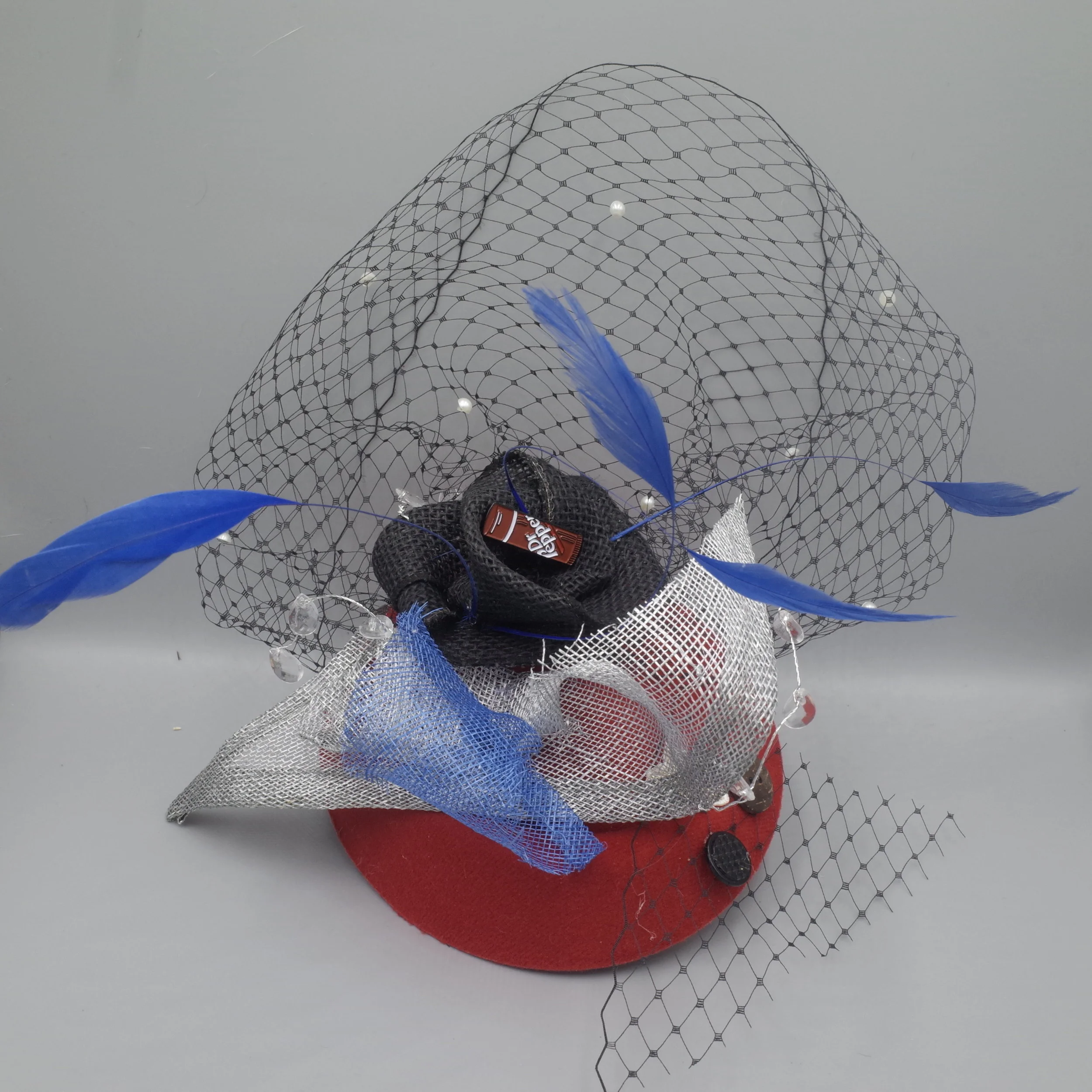 Dr. Pepper 可乐, 2017. Red felt fasicnator base from North Carolina; ivory, blue and silver sinamay trim from London; blue ostrich feather from North Carolina; black pearl veiling from North Carolina; black sinamay trim from New York; vintage Dr. Pepper chapstick brooch from Jamestown, New York.