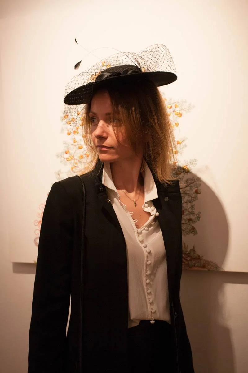 Bird Nest 鸟巢, 2017. Handpainted fascinator base; painted ostrich feather from London; silver sinamay trim from London; black sinamay trim from New York; vintage daisy from a second hand Iranian book store in Boston.