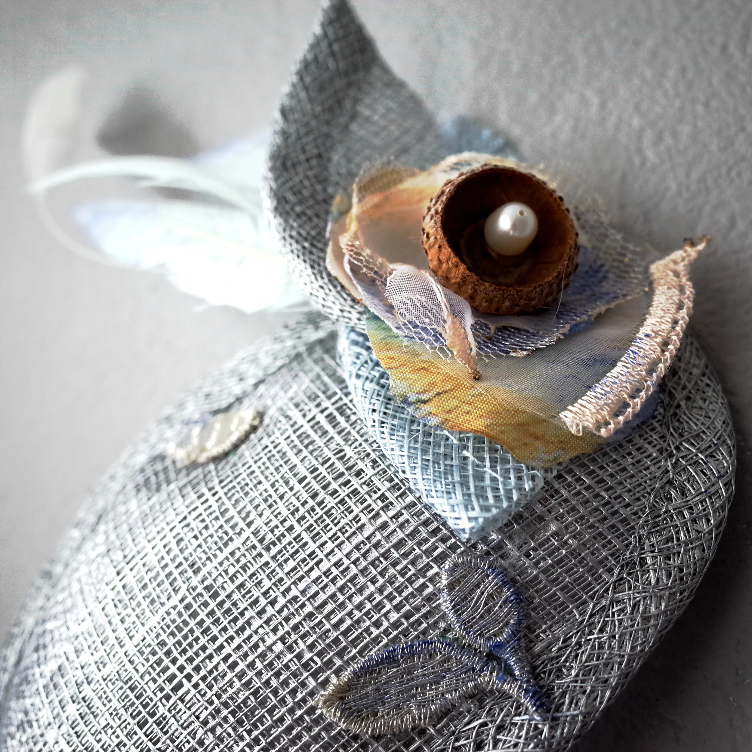 Eyes on Me 看着我, 2015. Silver sinamay teardrop fascinator base from London; cornflower blue feather from London; ivory ostrich feather from London; hazelnuts from New Haven; Monet's Pond fabric from a broken umbrella; sliver leaves from New York.