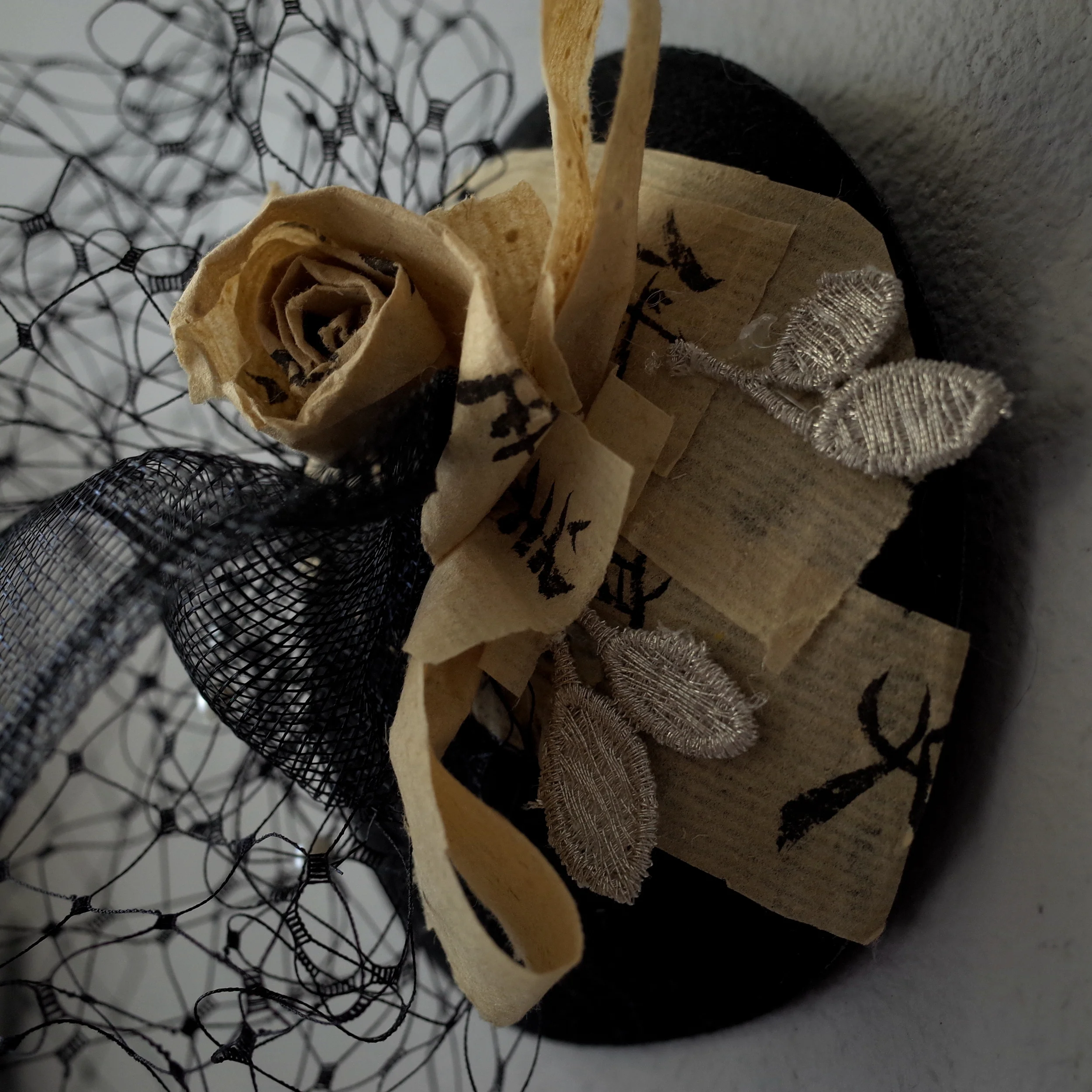 Write Rose 写玫瑰, 2015. Black cotton fascinator base from Fujian; teared calligraphy fragments from Wei Jia; black sinamay hush trim from London; pearl black veiling from London; silver leaves from New York.