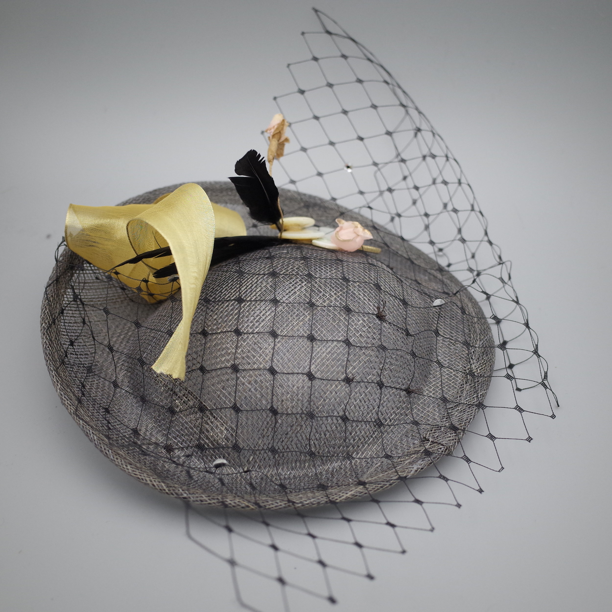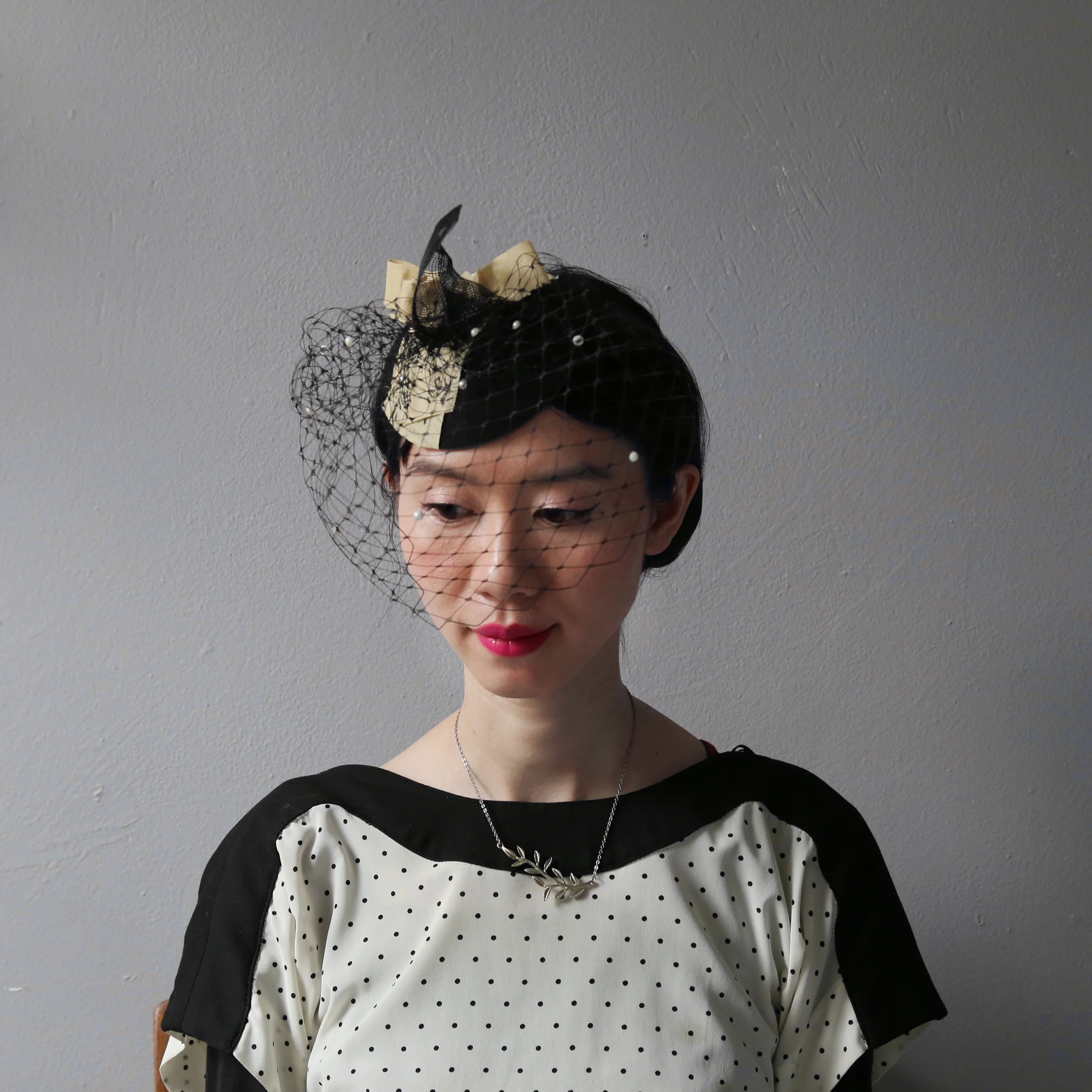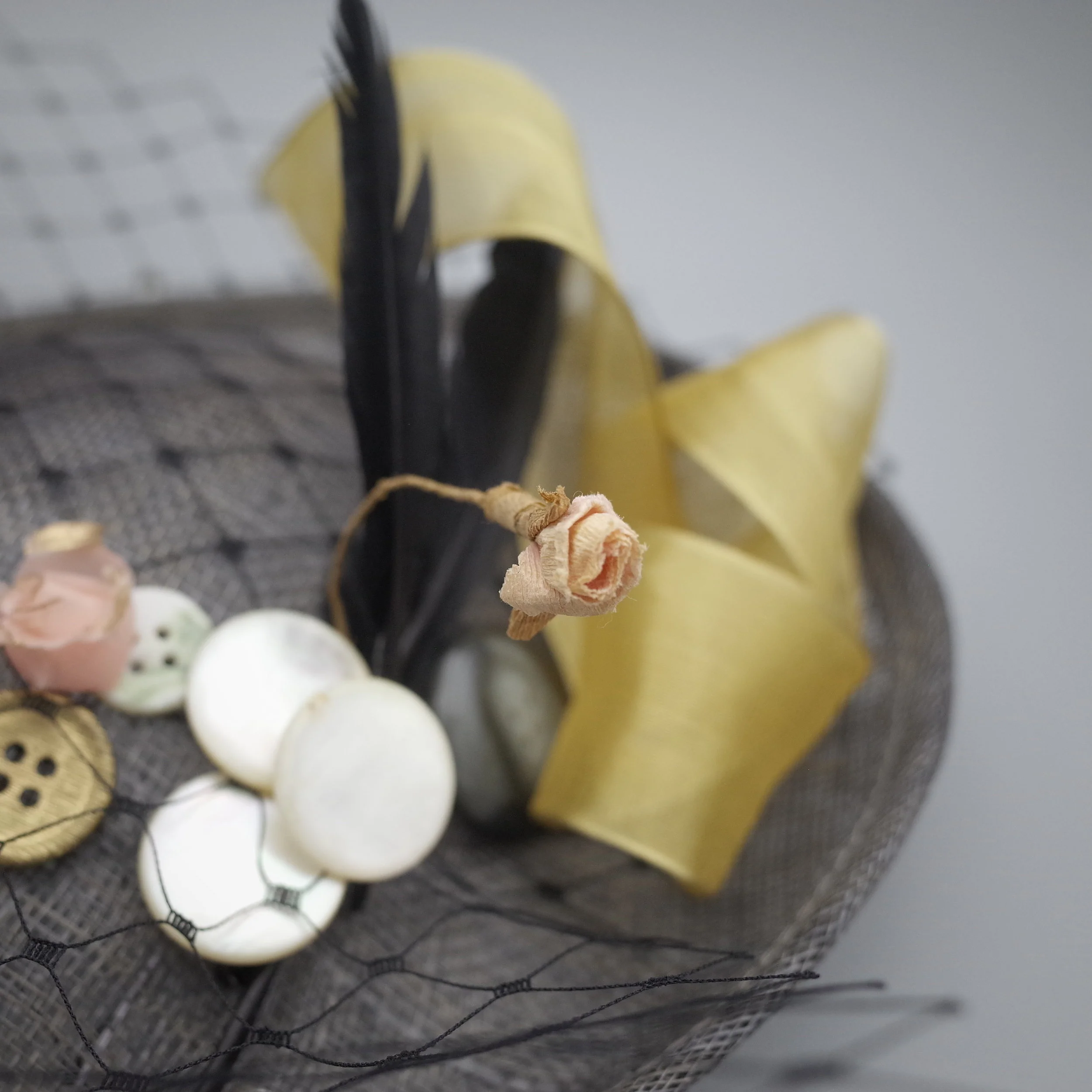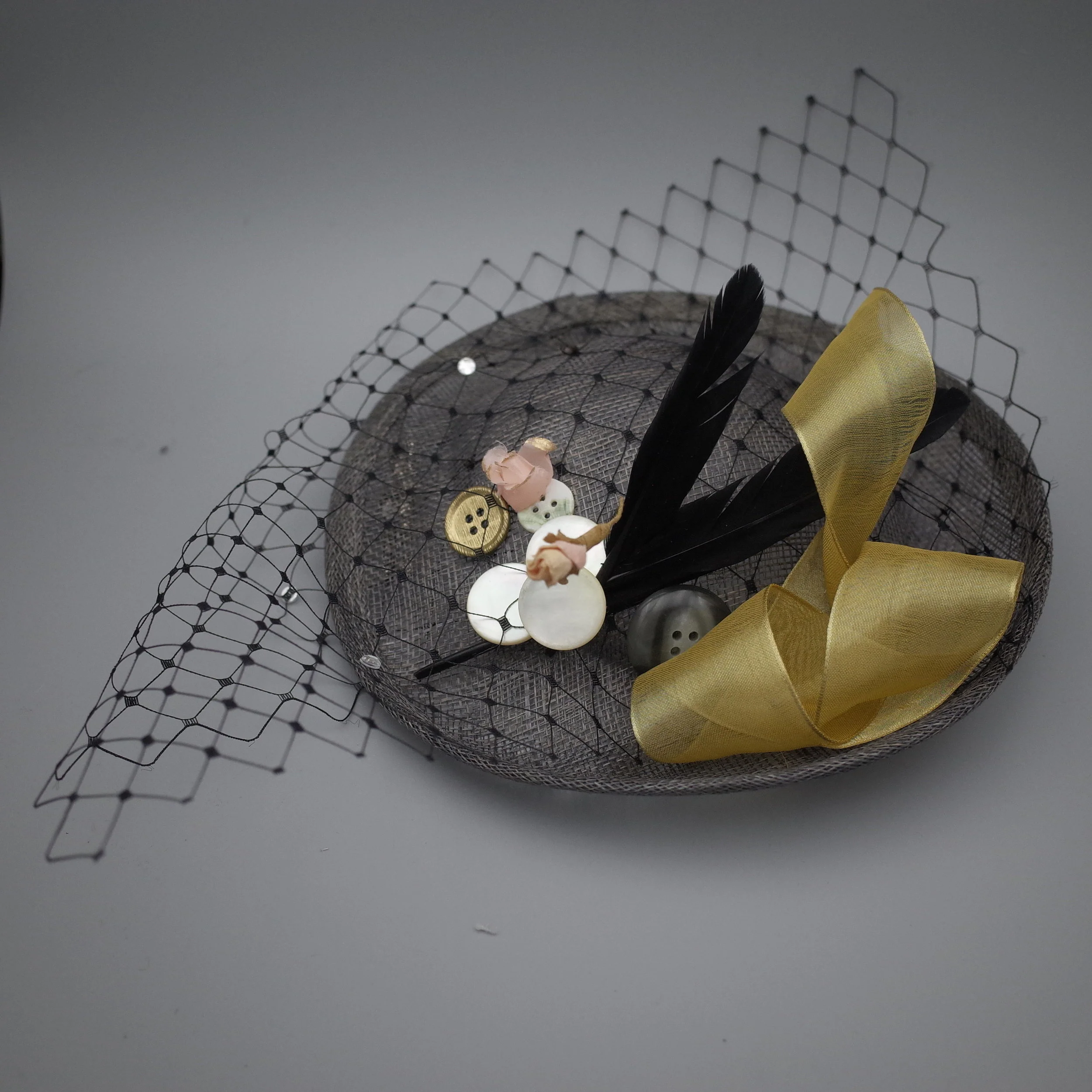 City Light 城市灯光, 2017. Grey sinamay fascinator base from London; black plain veiling from London; black feather from New York; vintage bottons from artist Morgan O'Hara; vintage golden ribbon from Morgan O'Hara.