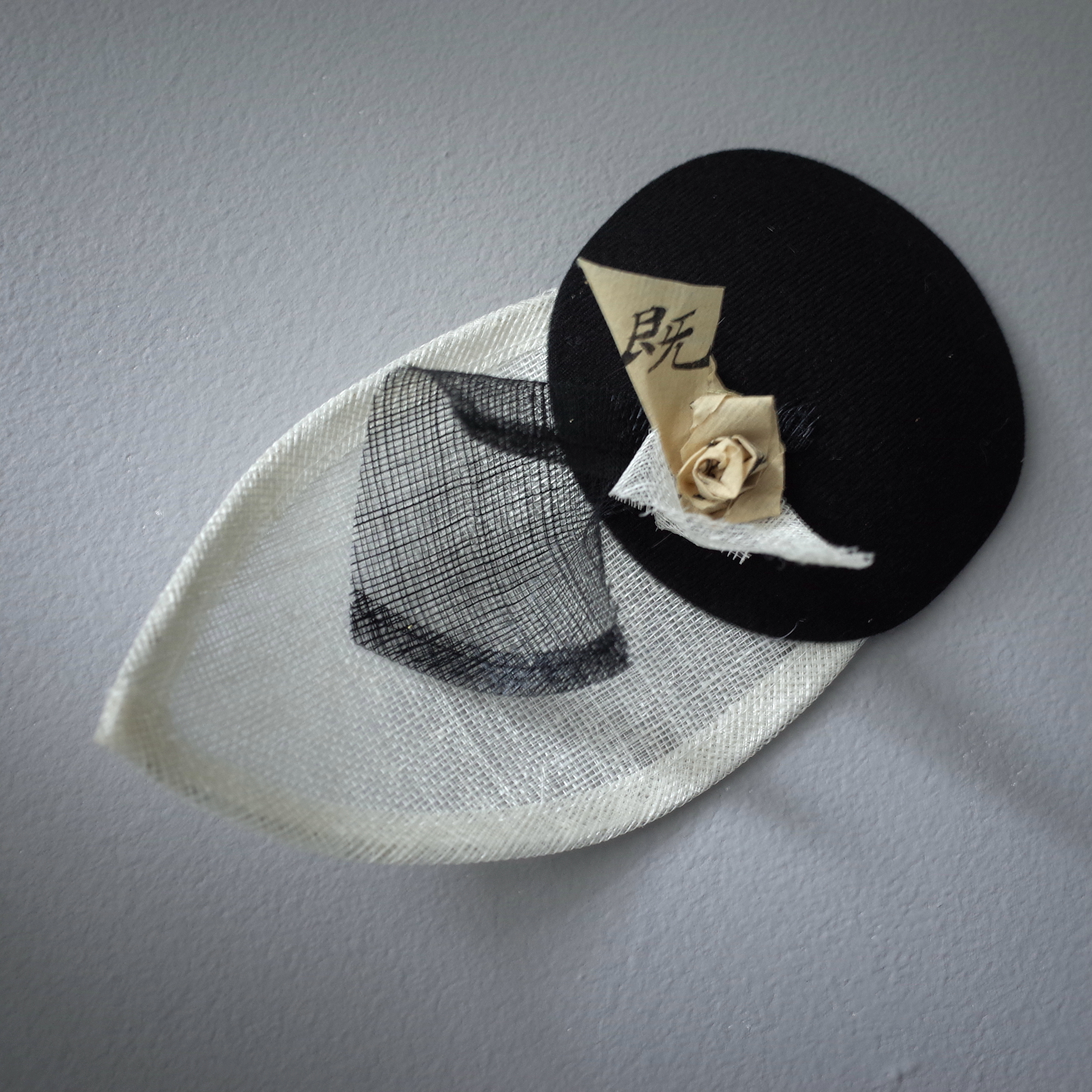 Ji 既, 2015. Black cutton round fascinator base from Fujian; ivory teardrop sinamay fascinator base from London; ivory sinamay shush trim from London; teared calligraphy fragments from Wei Jia