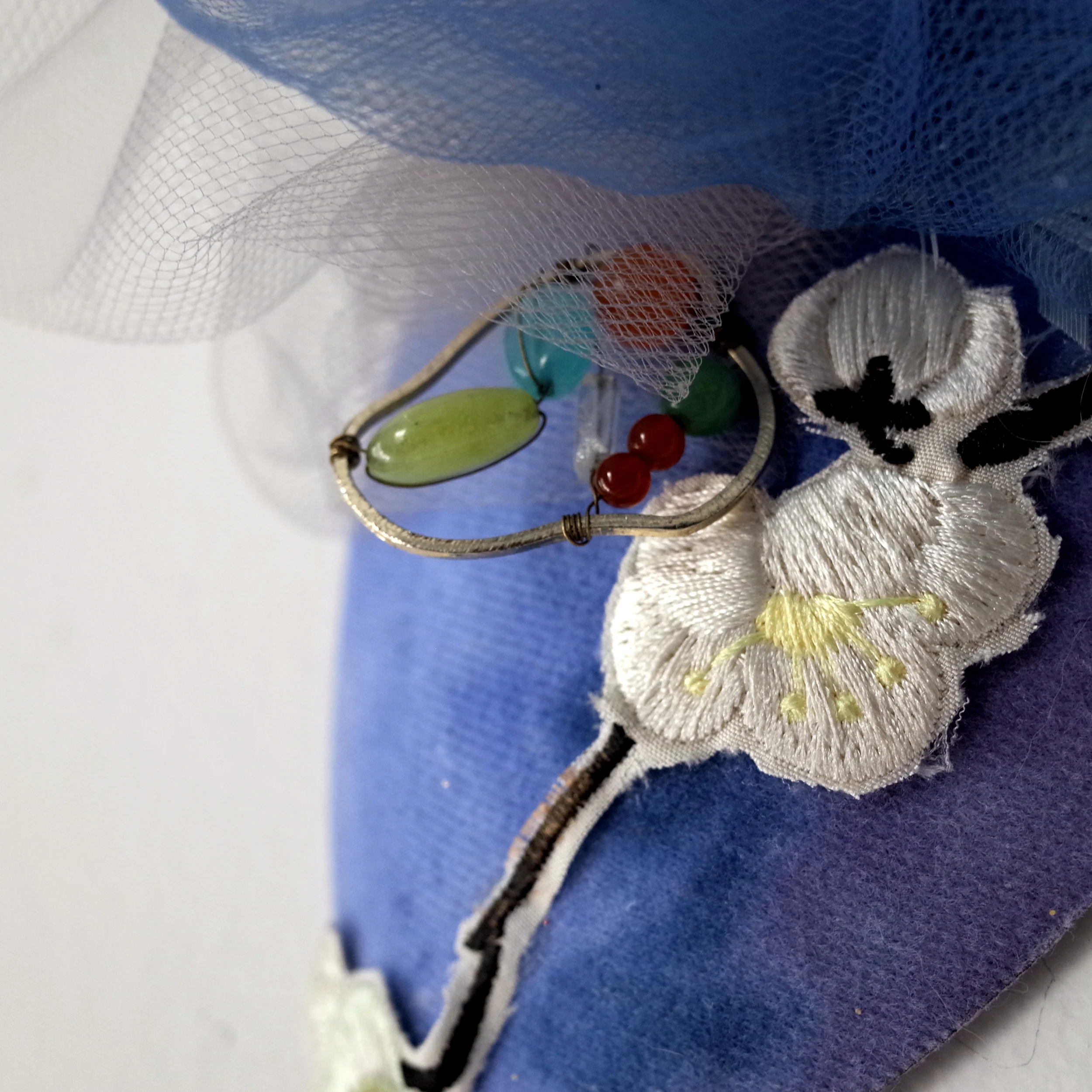 Plum Blossoms in the Snow 踏雪寻梅, 2015. Royal blue cotton fascinator base from Fujian; ivory sinamay shush trim from London; plum blossoms from a wornout Han robe