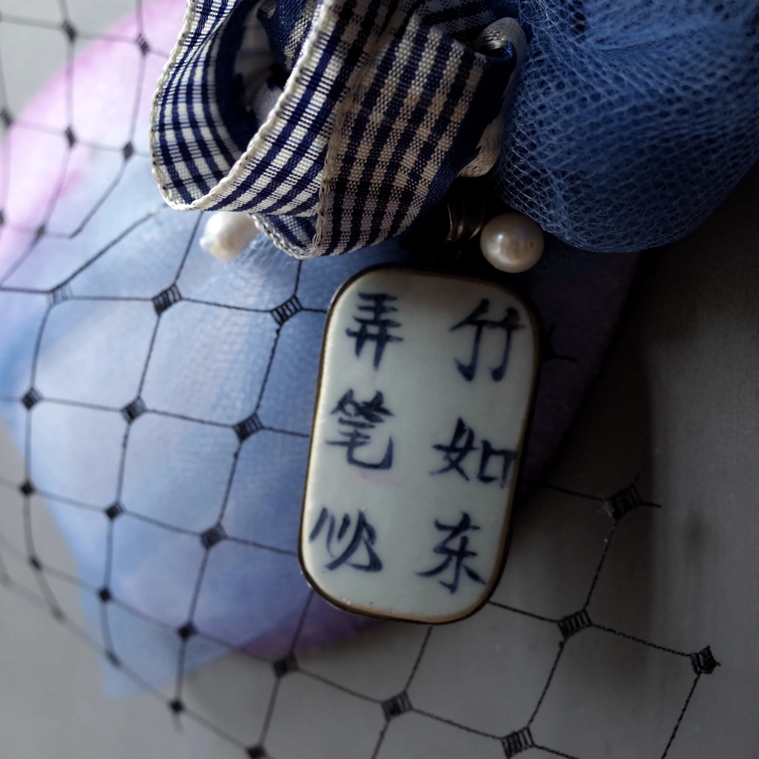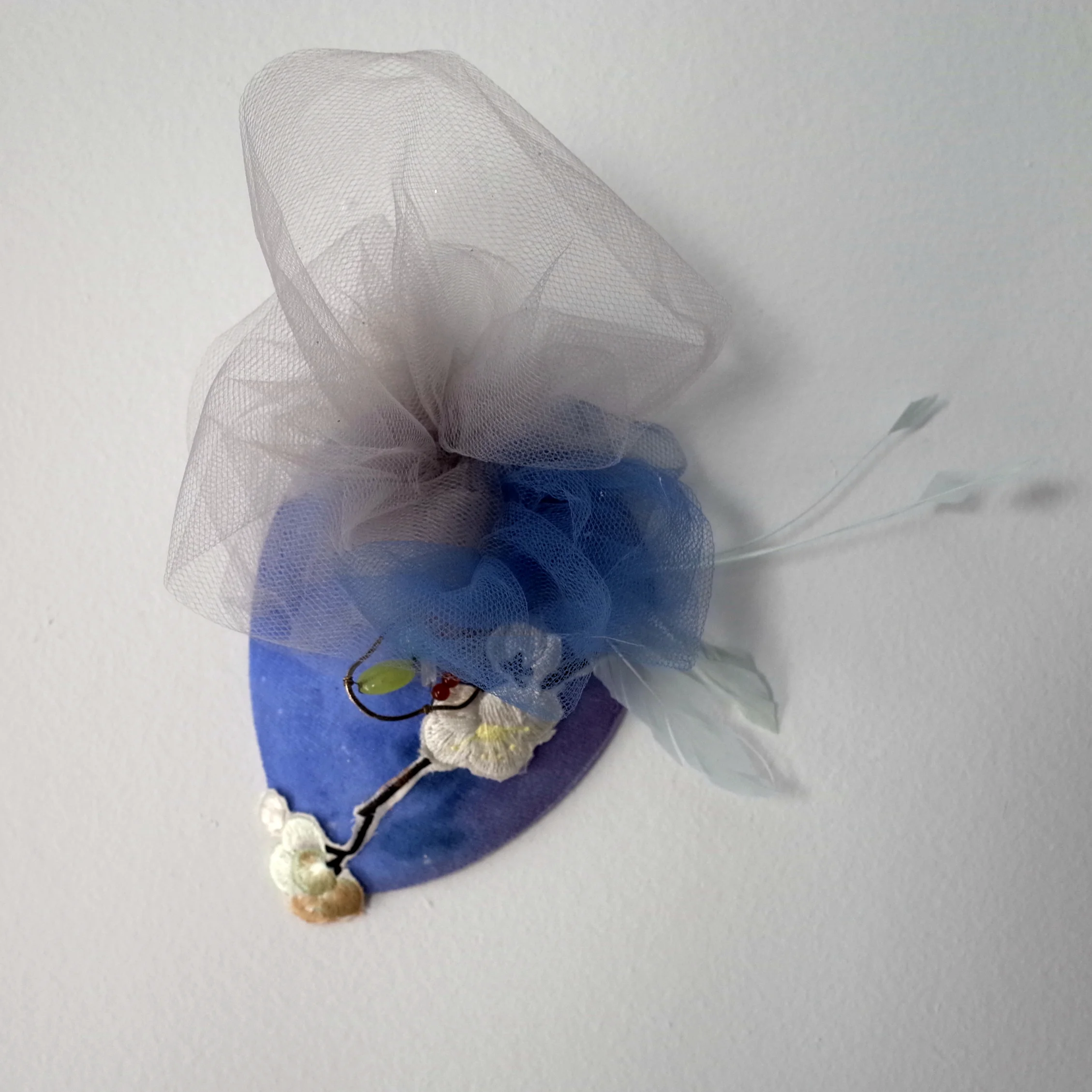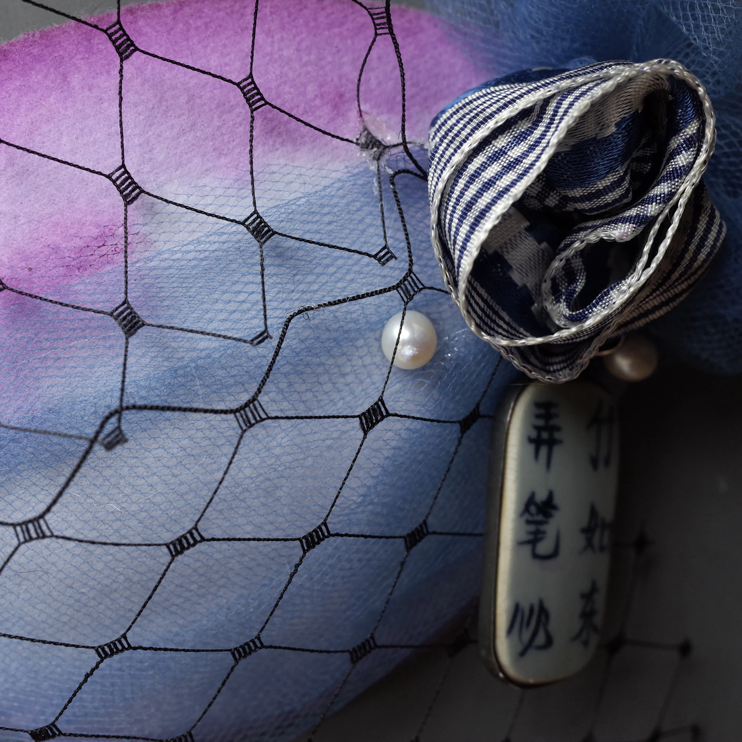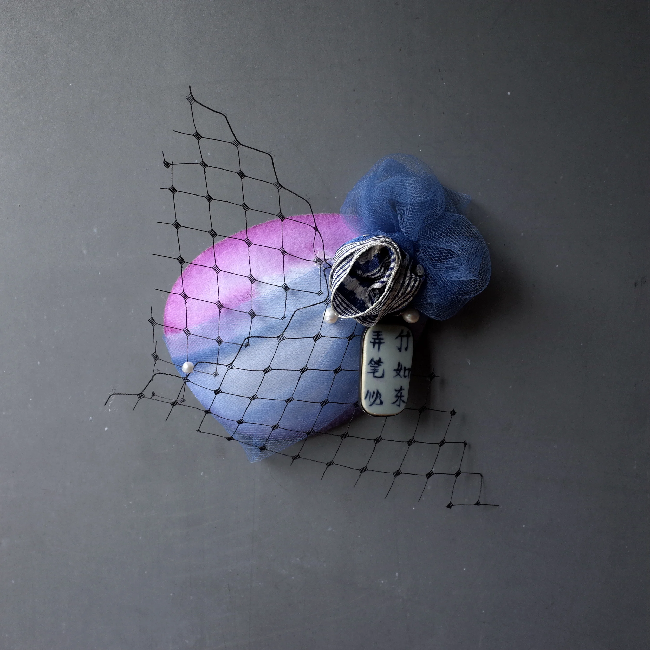Bamboo 竹, 2016. Hand painted cotton fascinator base; blue and white ribbon from New York; blue yarn from Brooklyn; diamonte black veiling from London; a blue and white porcelain fragment from a used necklace.