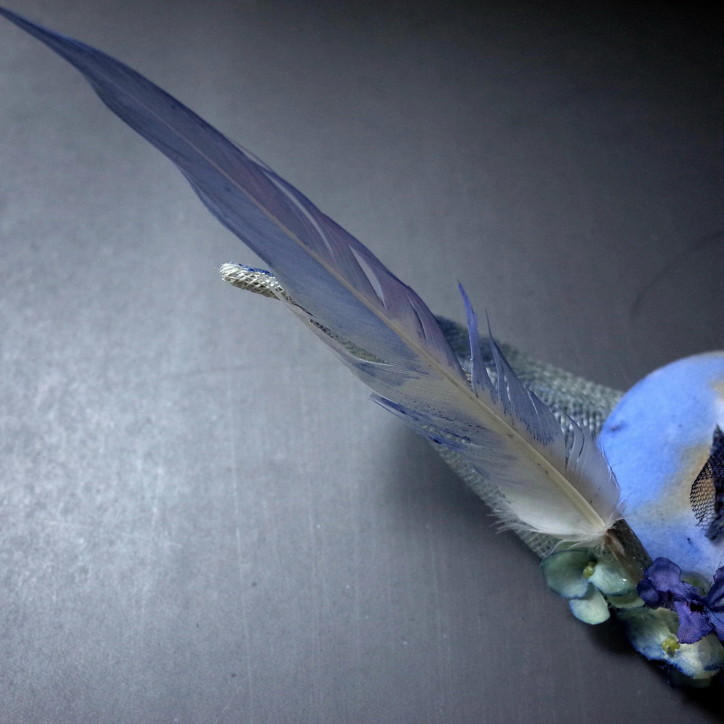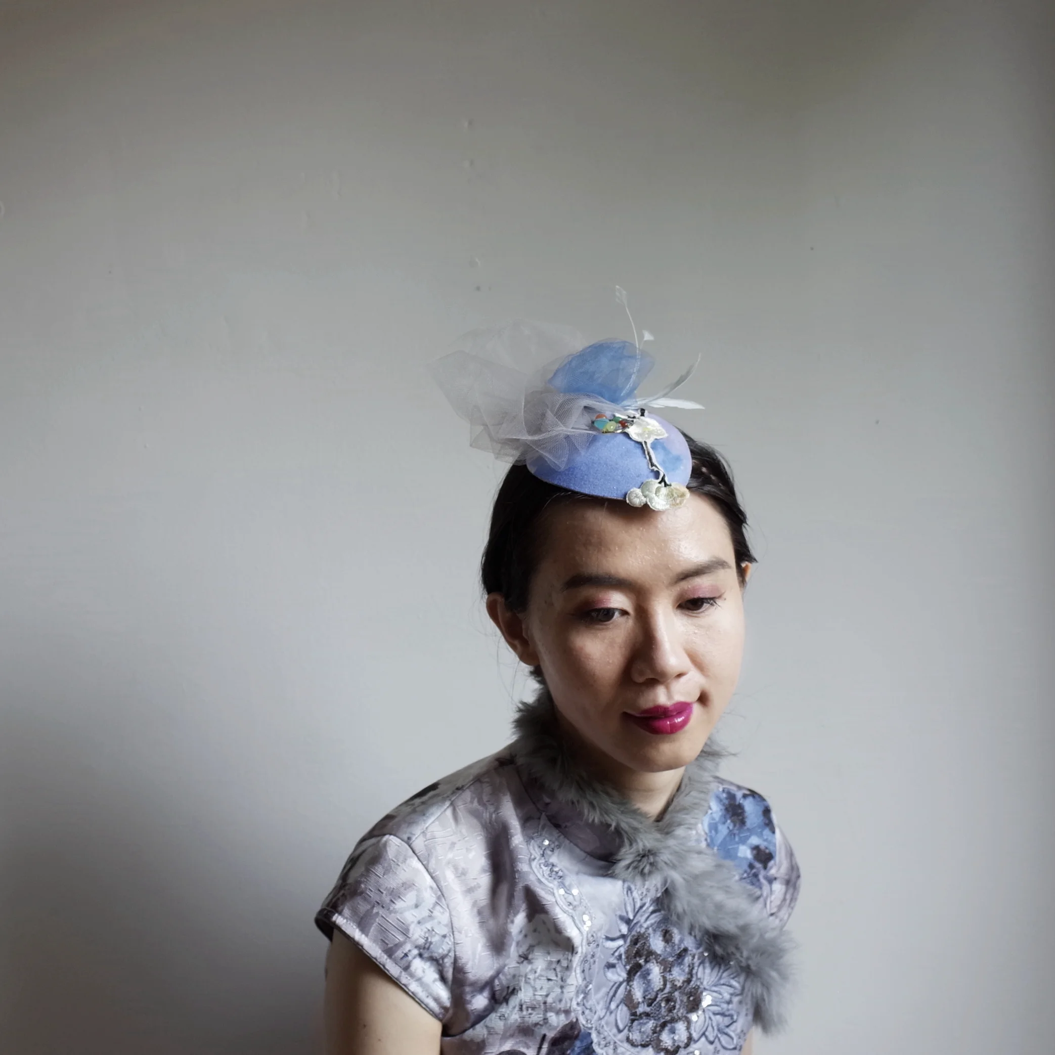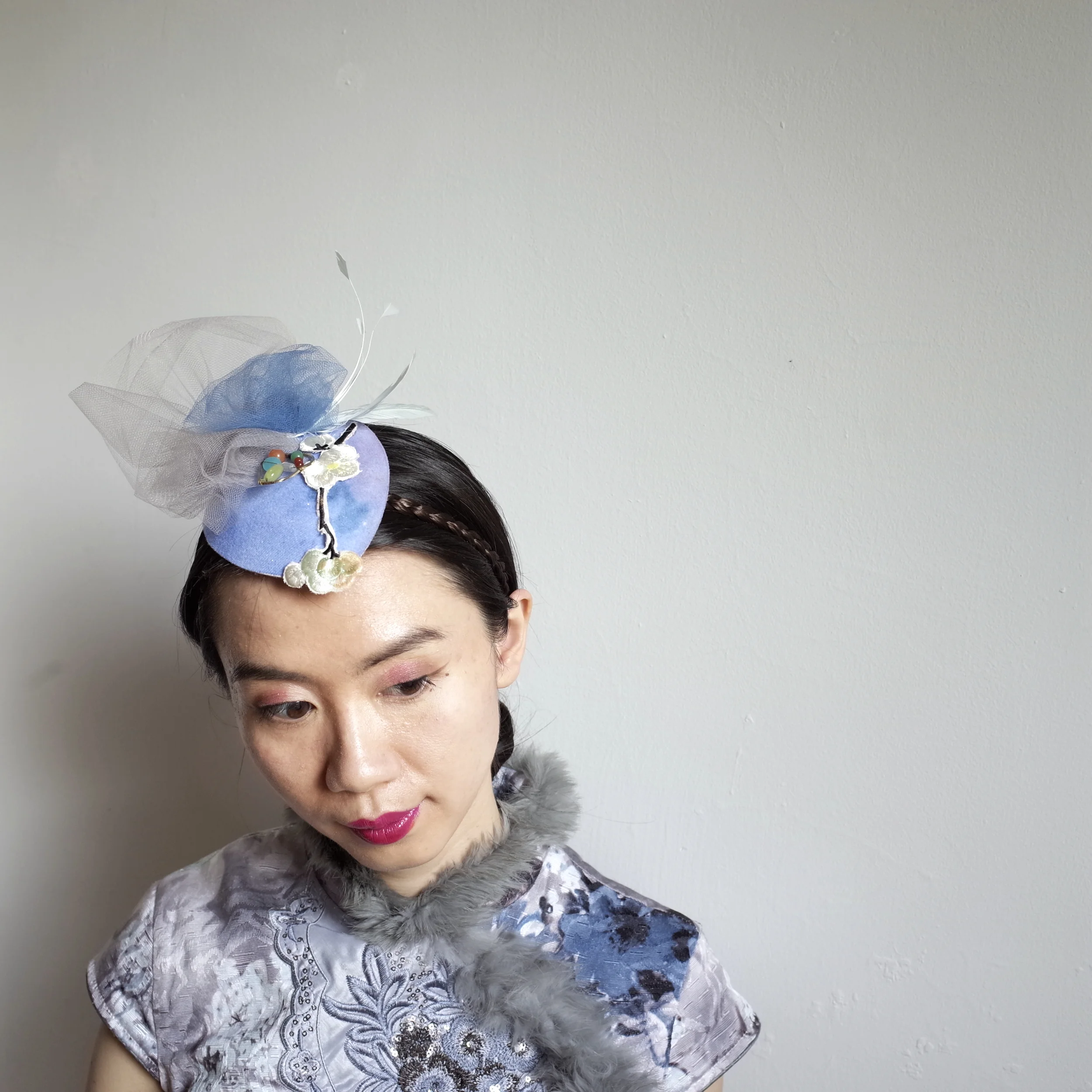 Stella Wind 星际风, 2016.4. Handpainted cotton fascinator base; grey and blue yarn from Brooklyn; plum blossoms from a wornout Han robe; jewelery piece made by Rachel Ye Seul; ivory ostrich feather from London.