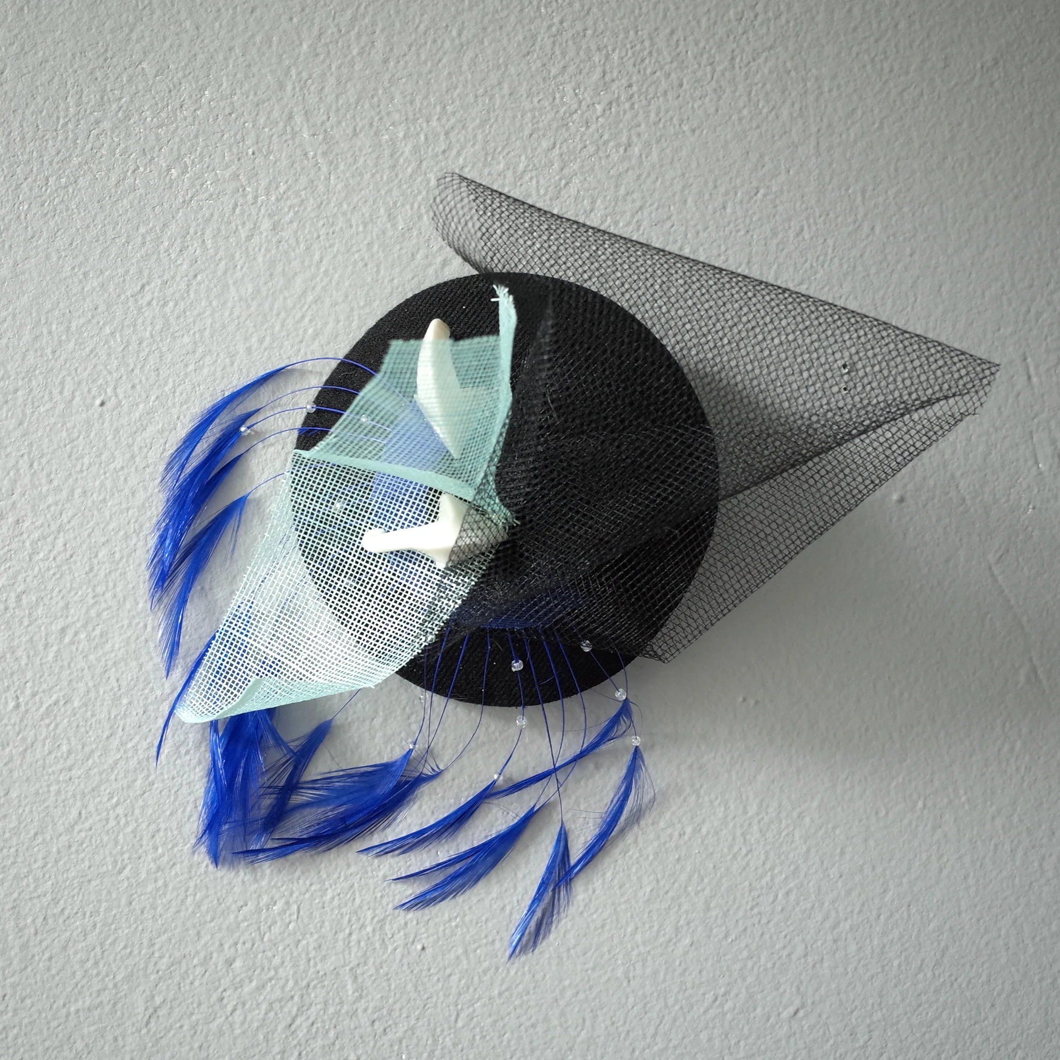 Little Bones 小骨头, 2016.1. Black cotton fascinator base from Fujian; black mesh from Brooklyn; aqua sinamay fabric from London; blue feather from New York; abandoned porcelain corns from Michele Fan