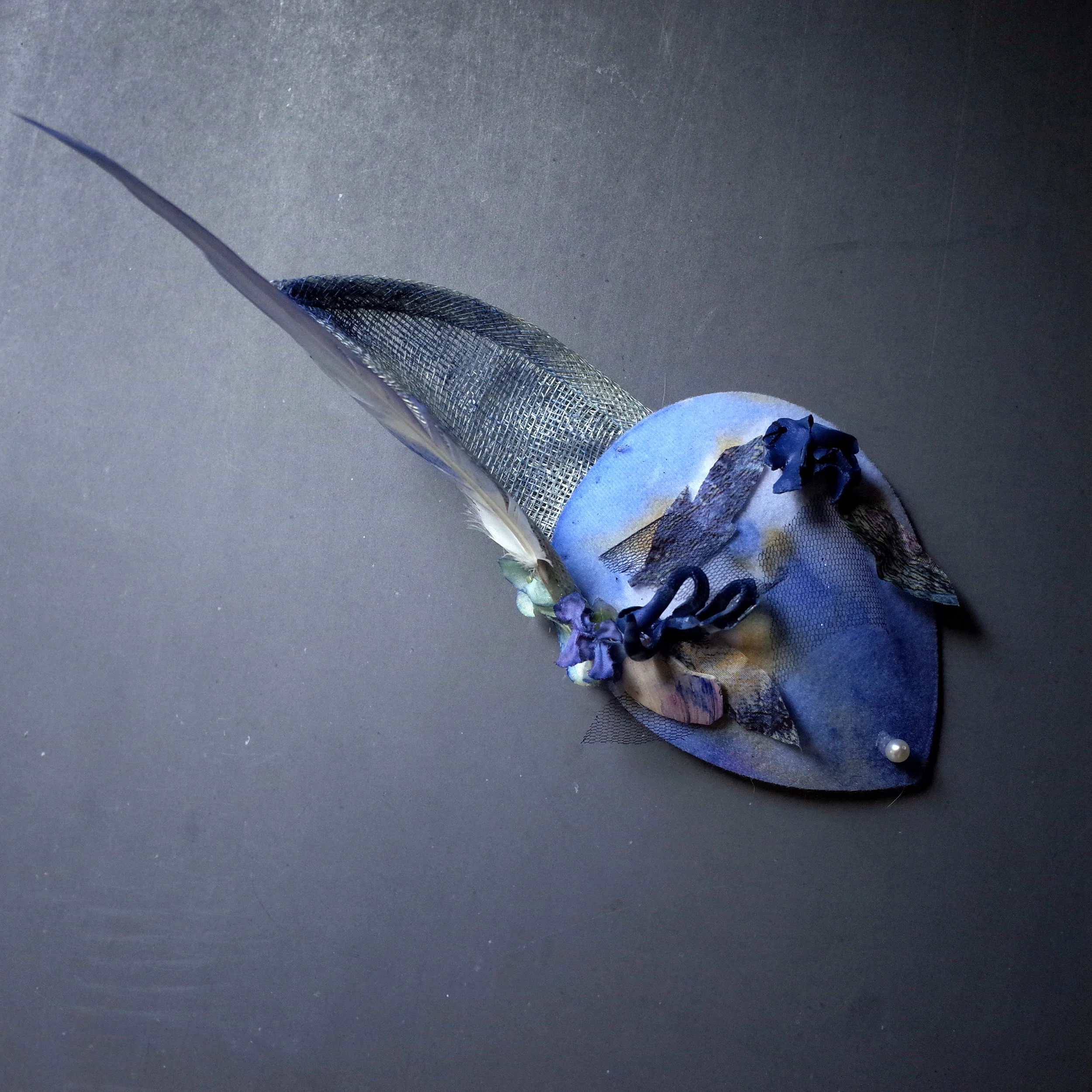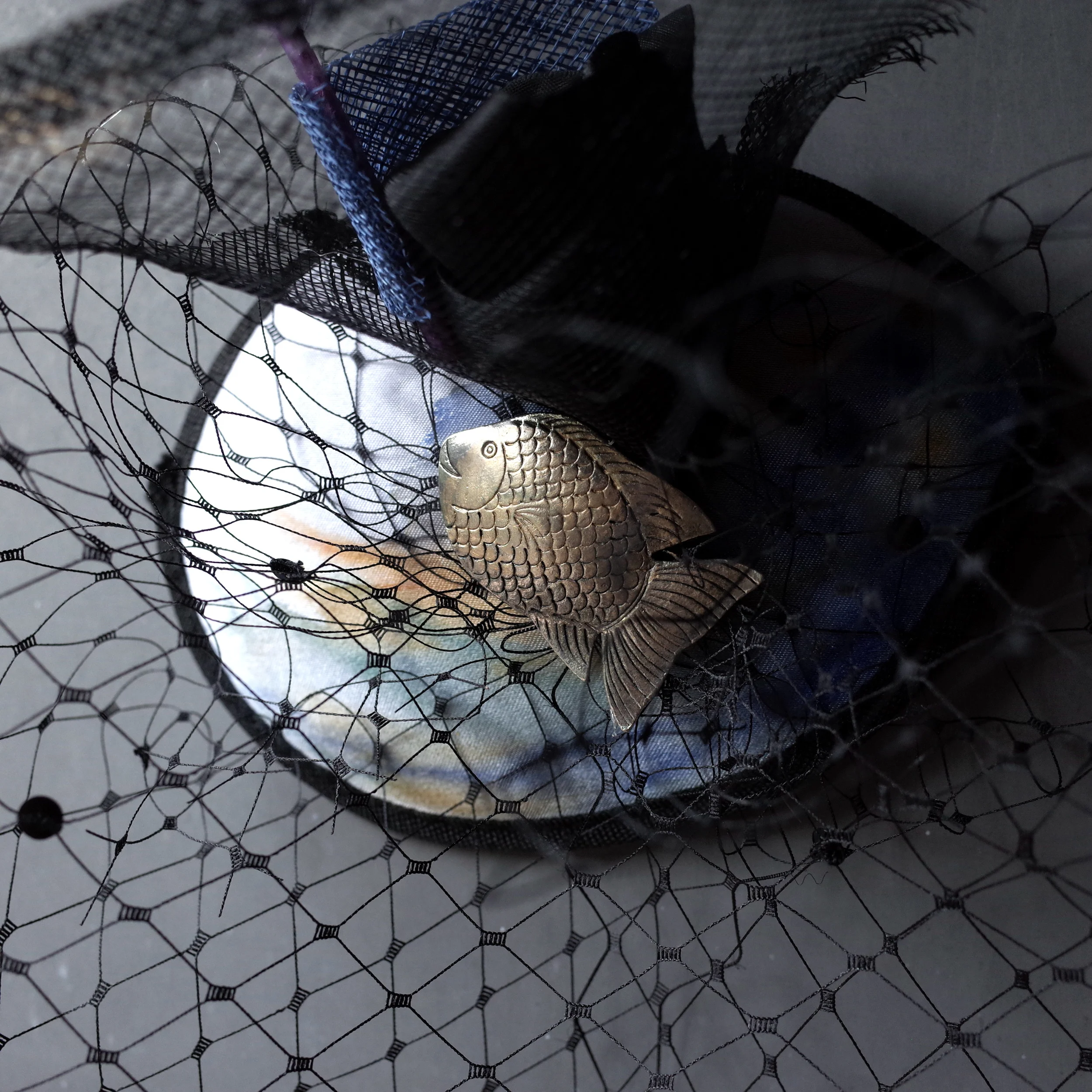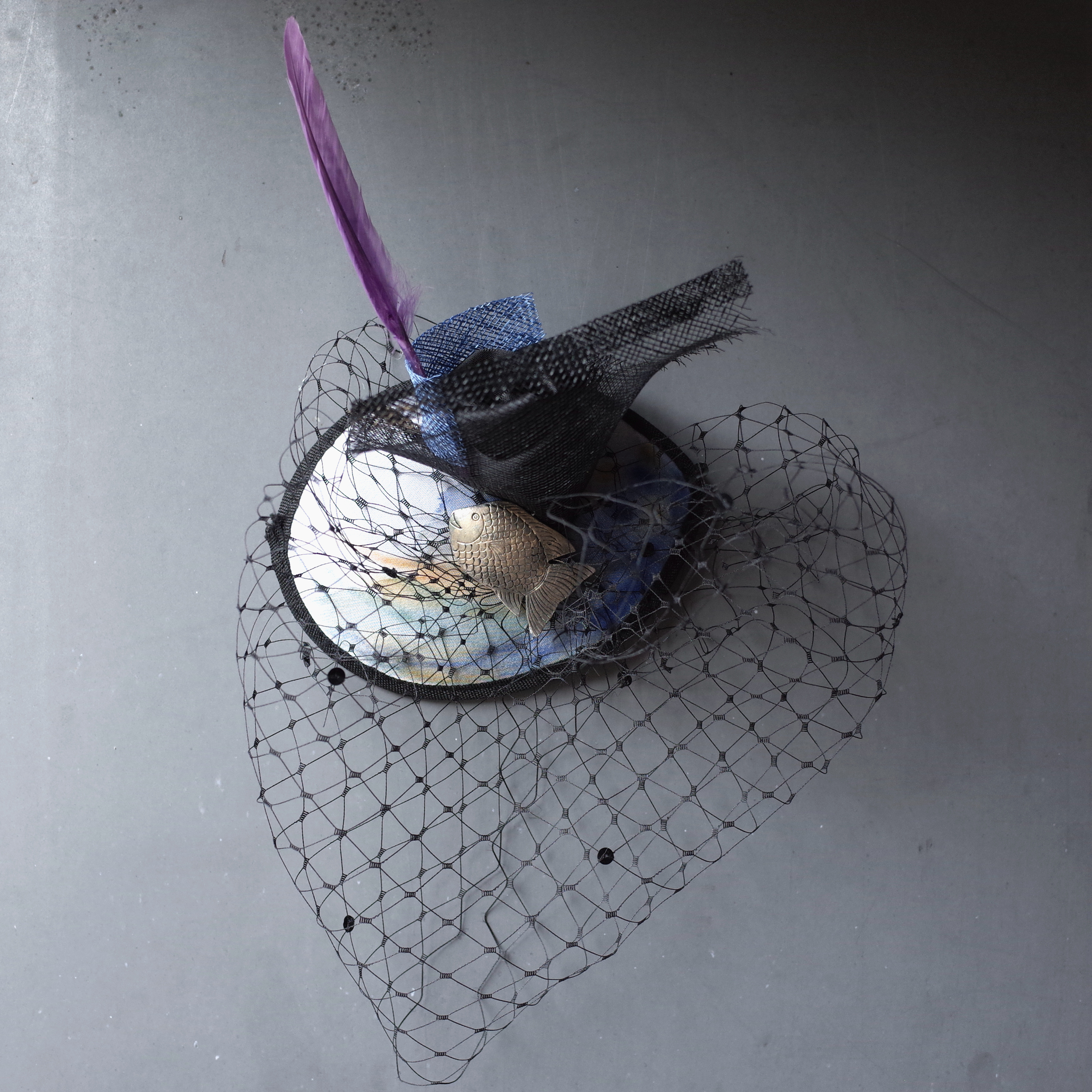 Silver Fish 银鱼, 2016. Hand painted silk fascinator base; black dot veiling from London; blue sinamay trim from London; black sinamay cut from London; a silver fish from a broken necklace; pink feather as a gift from Patricia Chen.