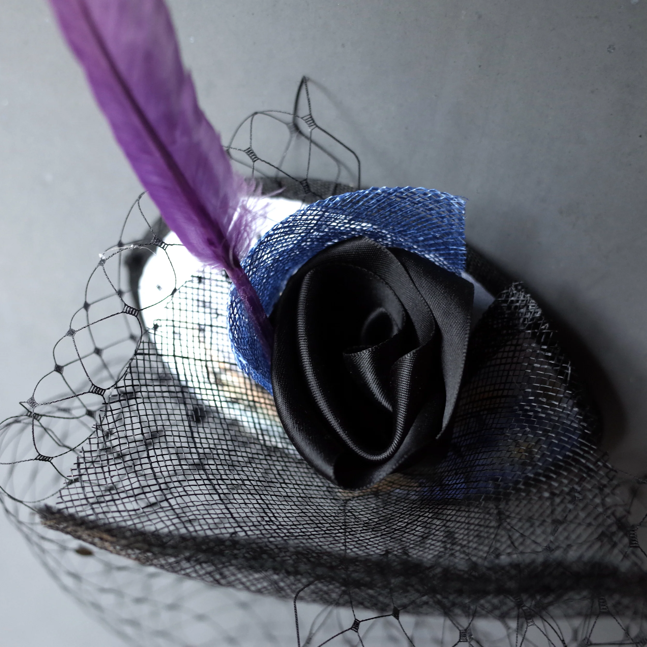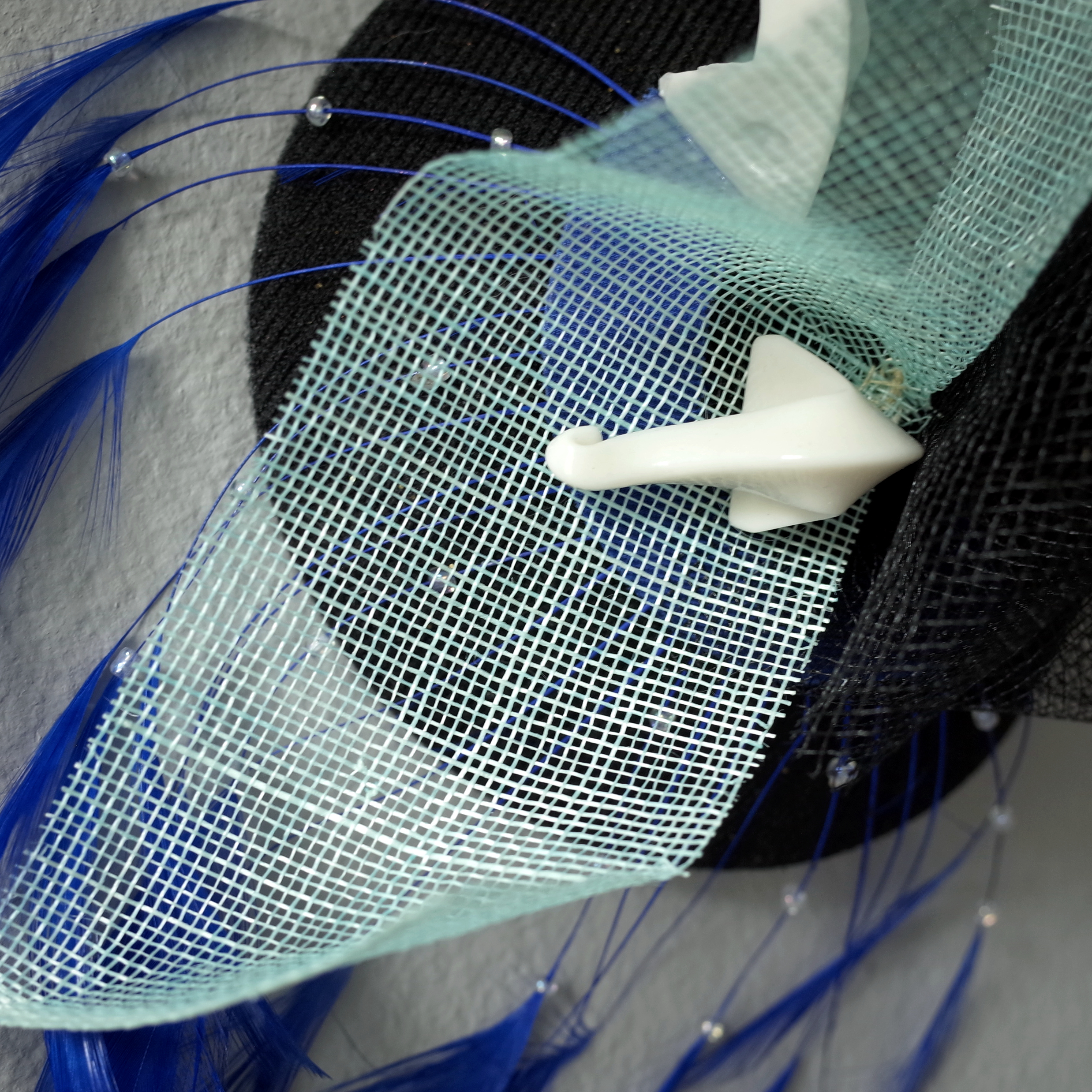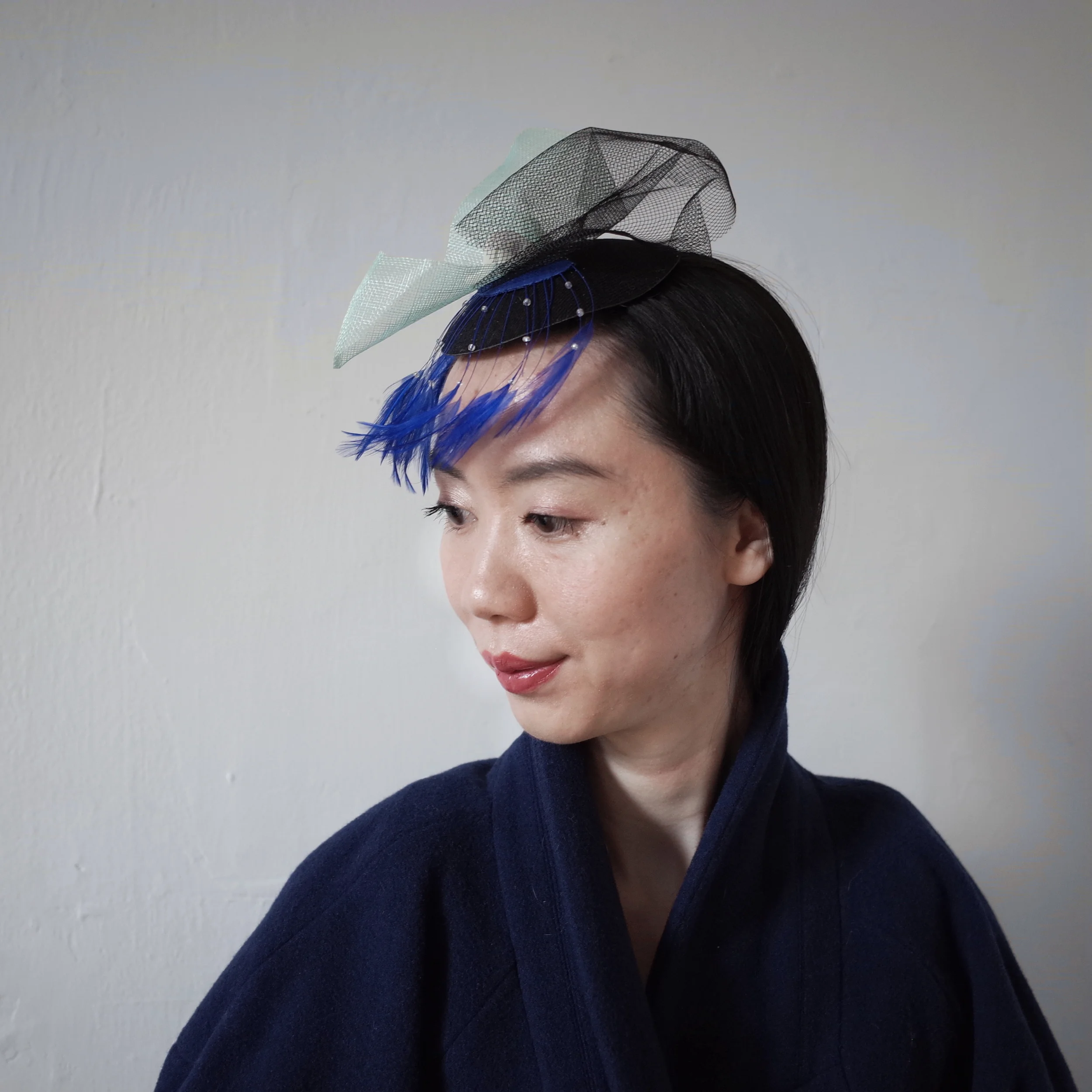 Silver Fish 银鱼, 2016. Hand painted silk fascinator base; black dot veiling from London; blue sinamay trim from London; black sinamay cut from London; a silver fish from a broken necklace; pink feather as a gift from Patricia Chen.