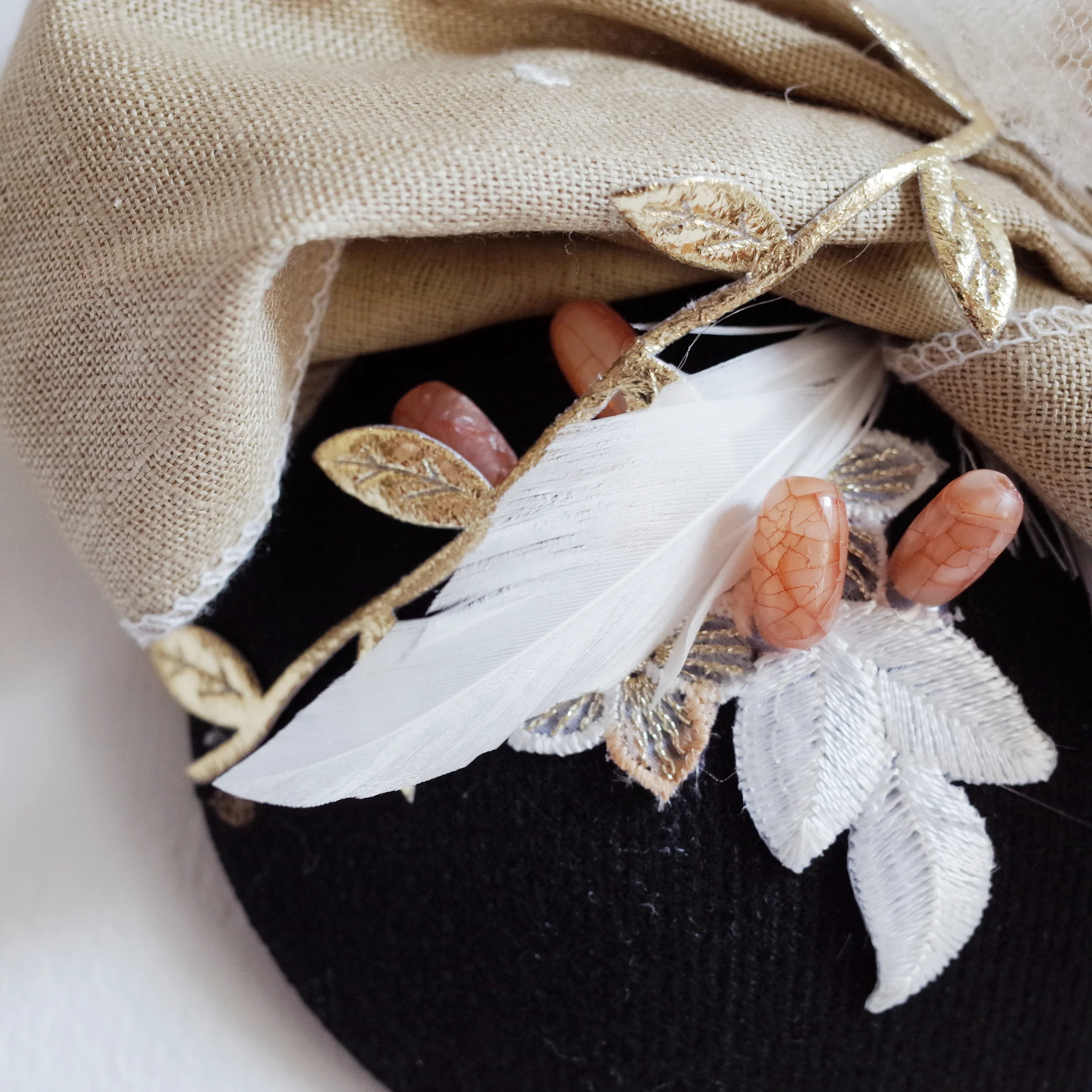 Golden Leaf 金树叶, 2016. Black cotton fascinator base from Fujian; ivory ostrich feather from London; Easter olive decoration from St. Paul's Lutheran Church of Williamsburg; ivory shining yarn from Brooklyn; light yellow cotton fabric as a gift from Helene Lipstadt.