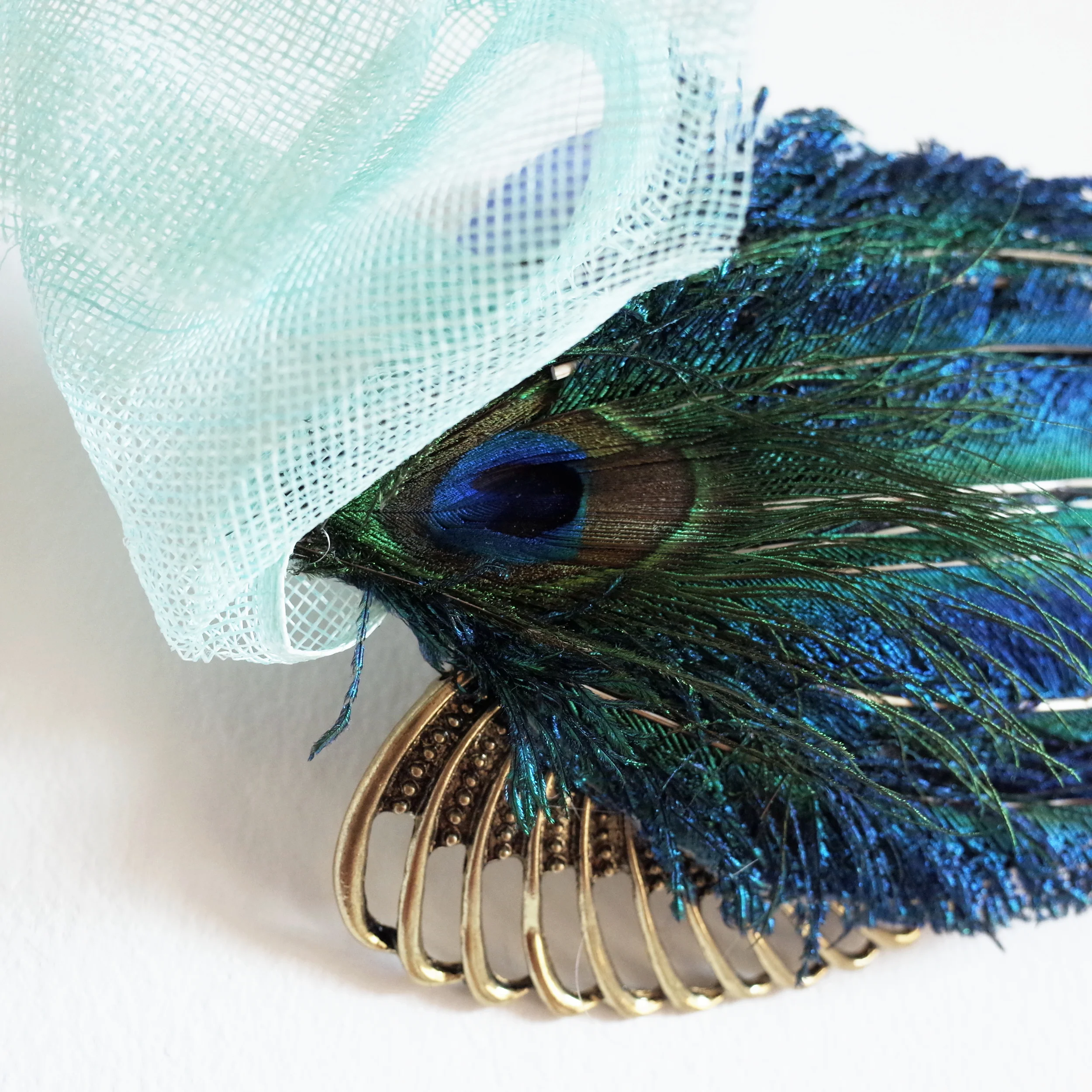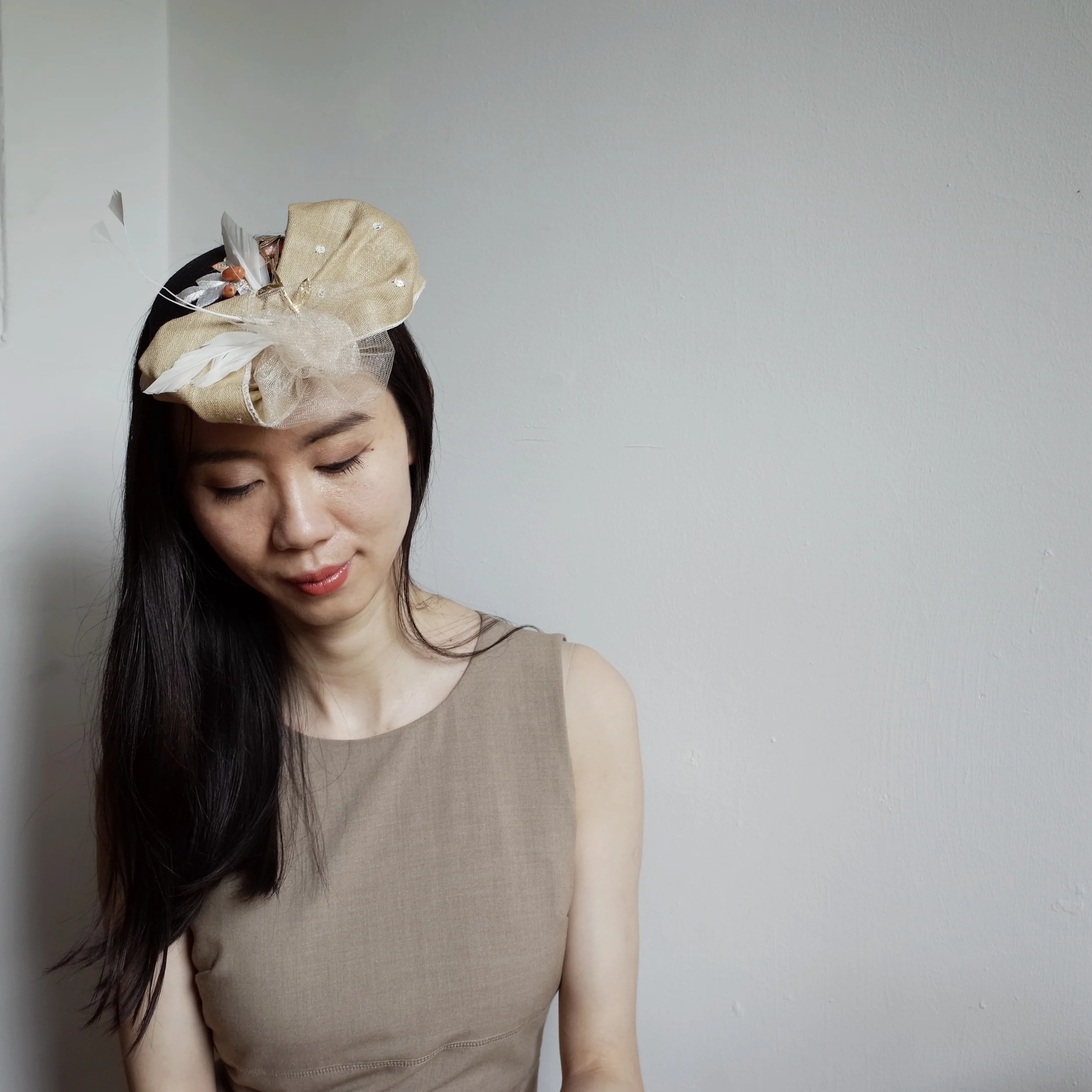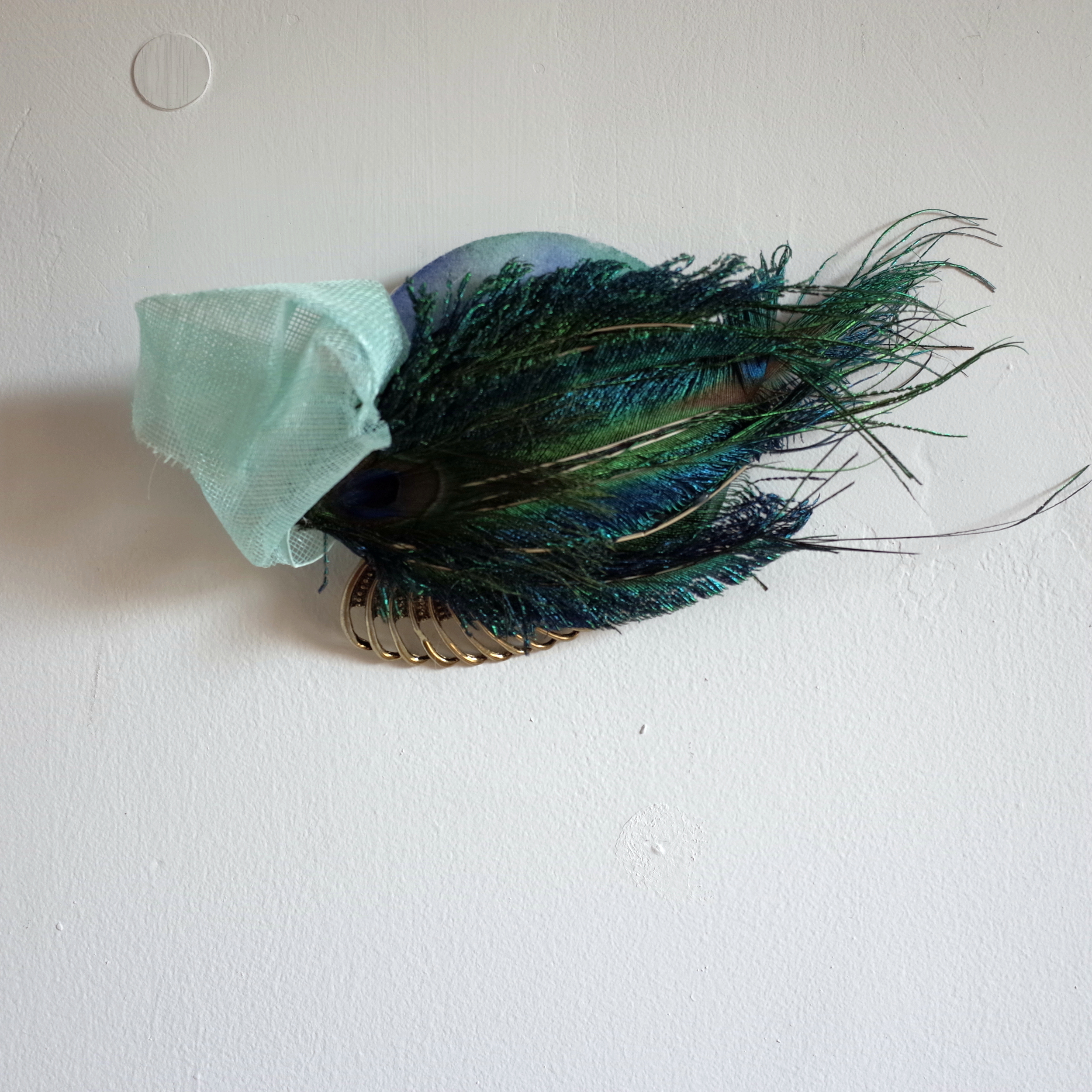 Peacock 孔雀, 2016. Hand painted cutton fascinator base; aqua sinamay fabric from London; peacock feather from New York; golden wing from an old necklace.