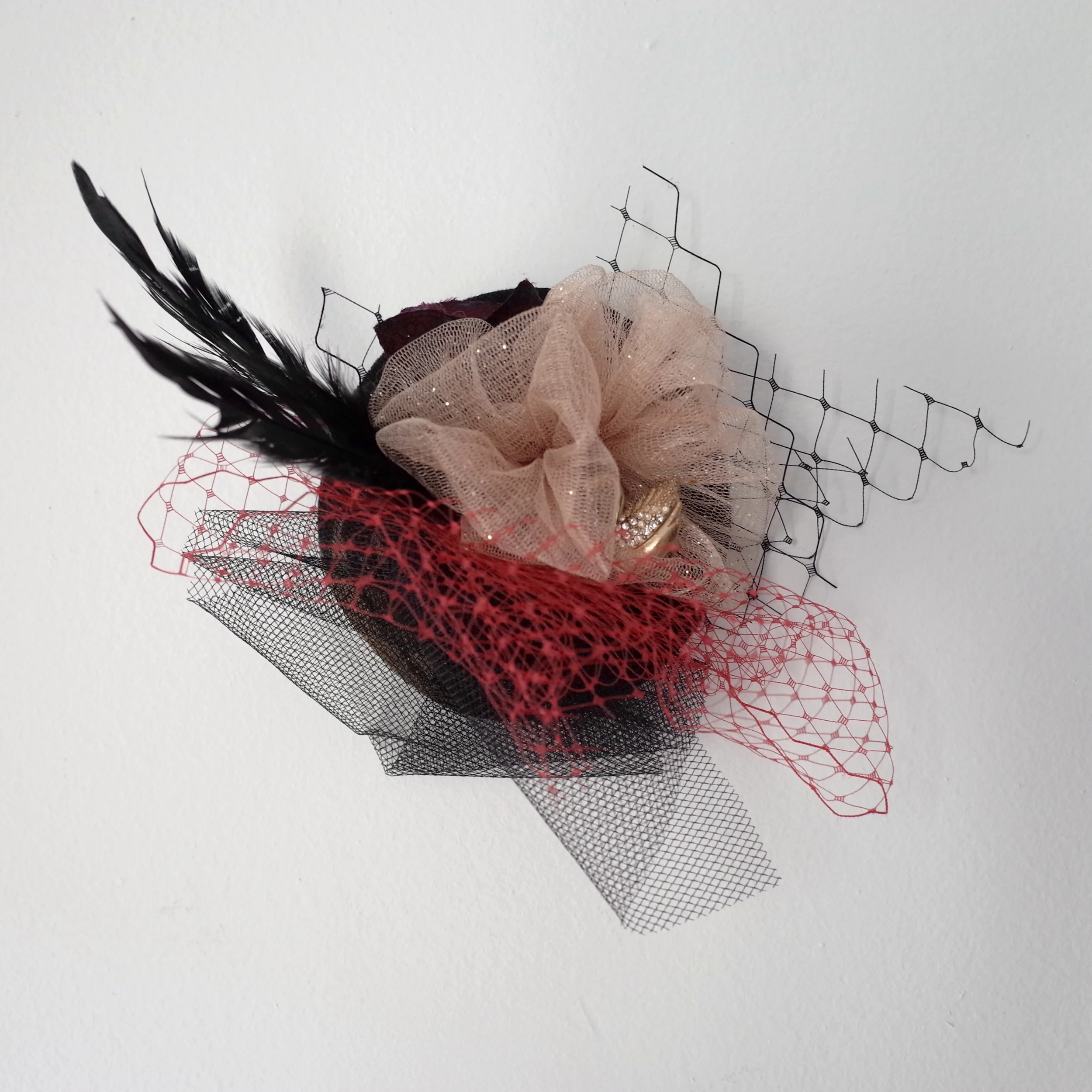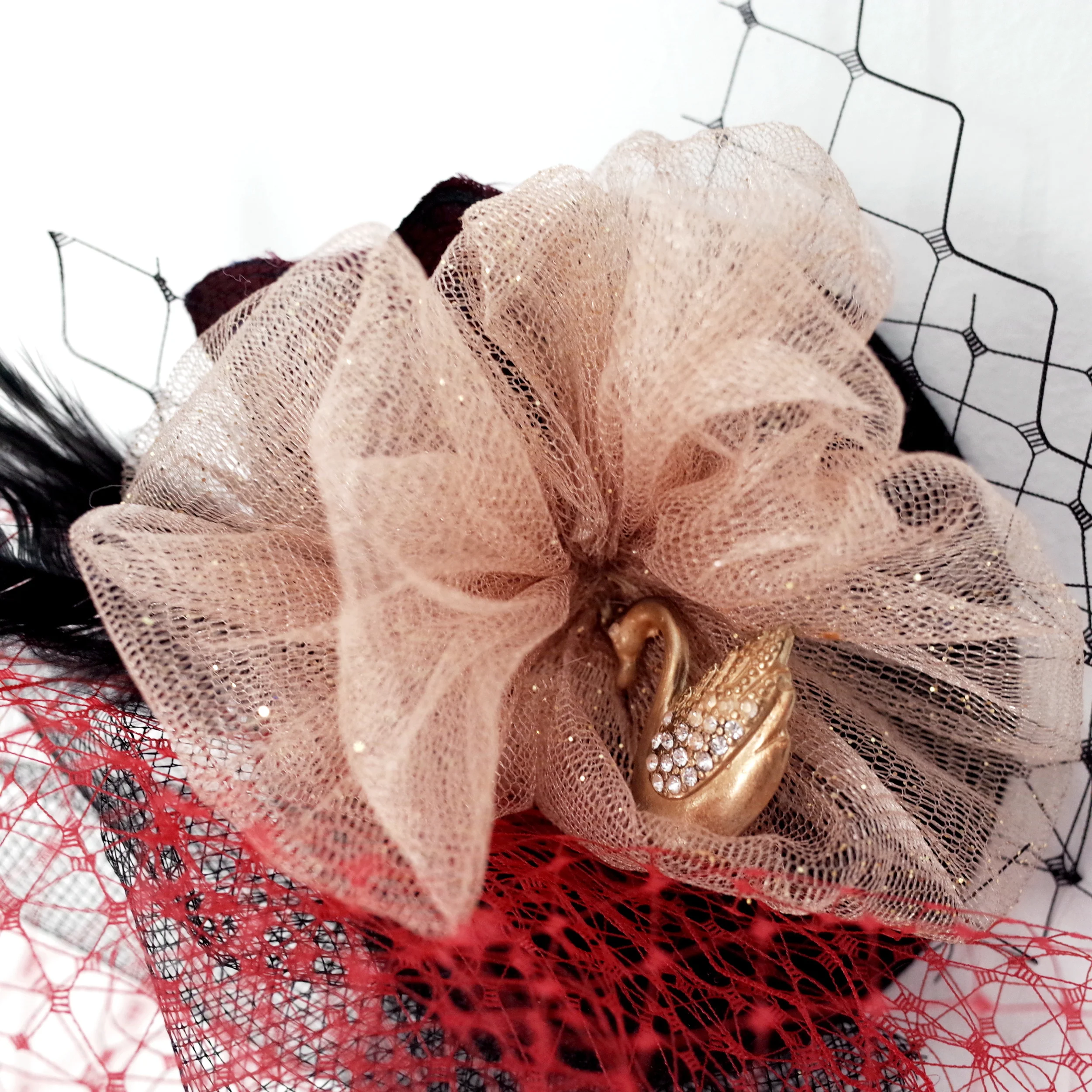 Swan Lake 天鹅湖, 2016. Black fascinator base from Fujian; black sinamay shush trim from London; black mesh from Brooklyn; red plain veiling from London; a swan jewlery piece from an abandaned necklace; black feather from New York.