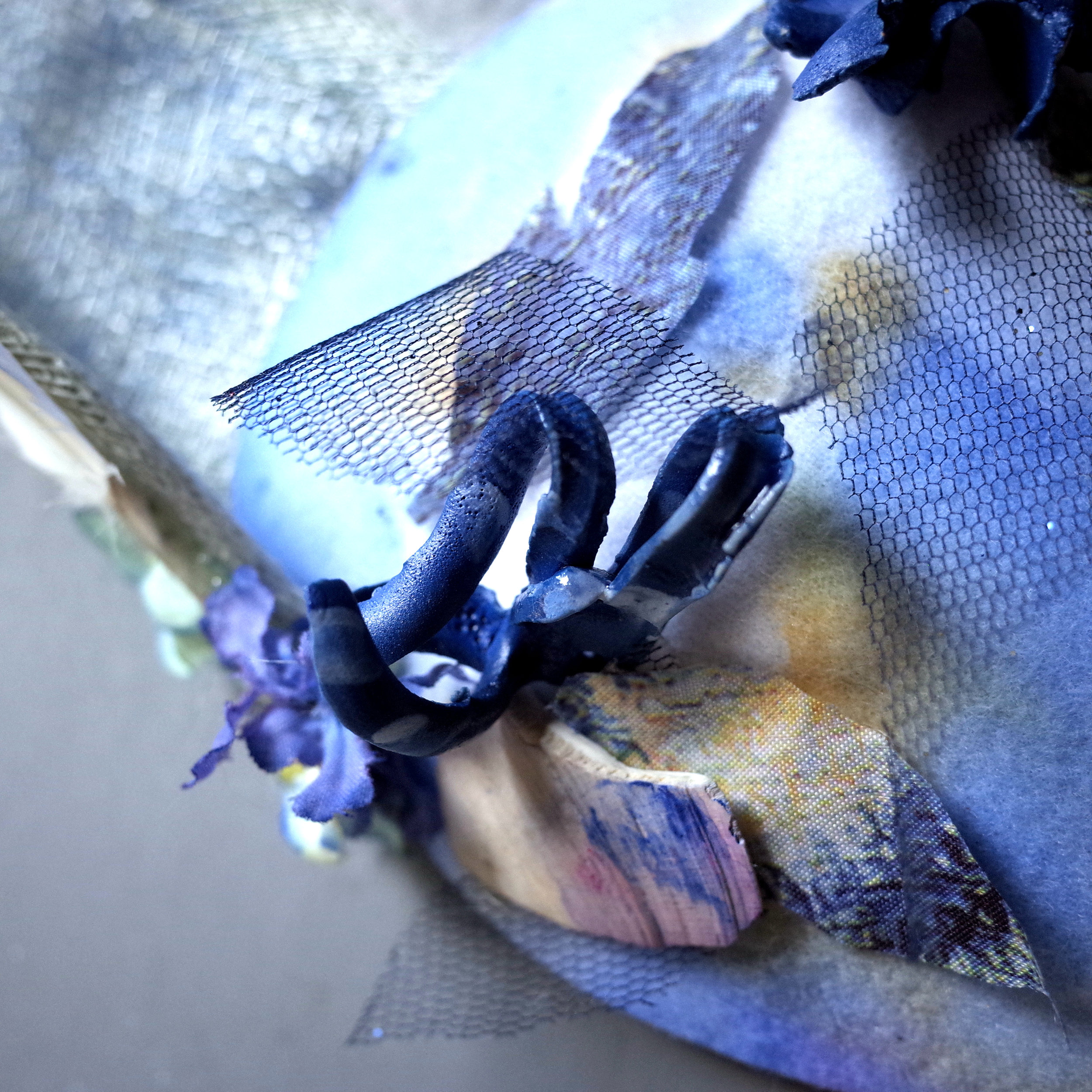Clay Iris 陶鸢尾, 2016. Hand painted teardrop fascinator base; silver teardrop sinamay fascinator base from London; Monet's Pond fabric from a broken umbrella; ceramic fragments from artist Yang Renqian; pearl as a gift from Hansi Liao.