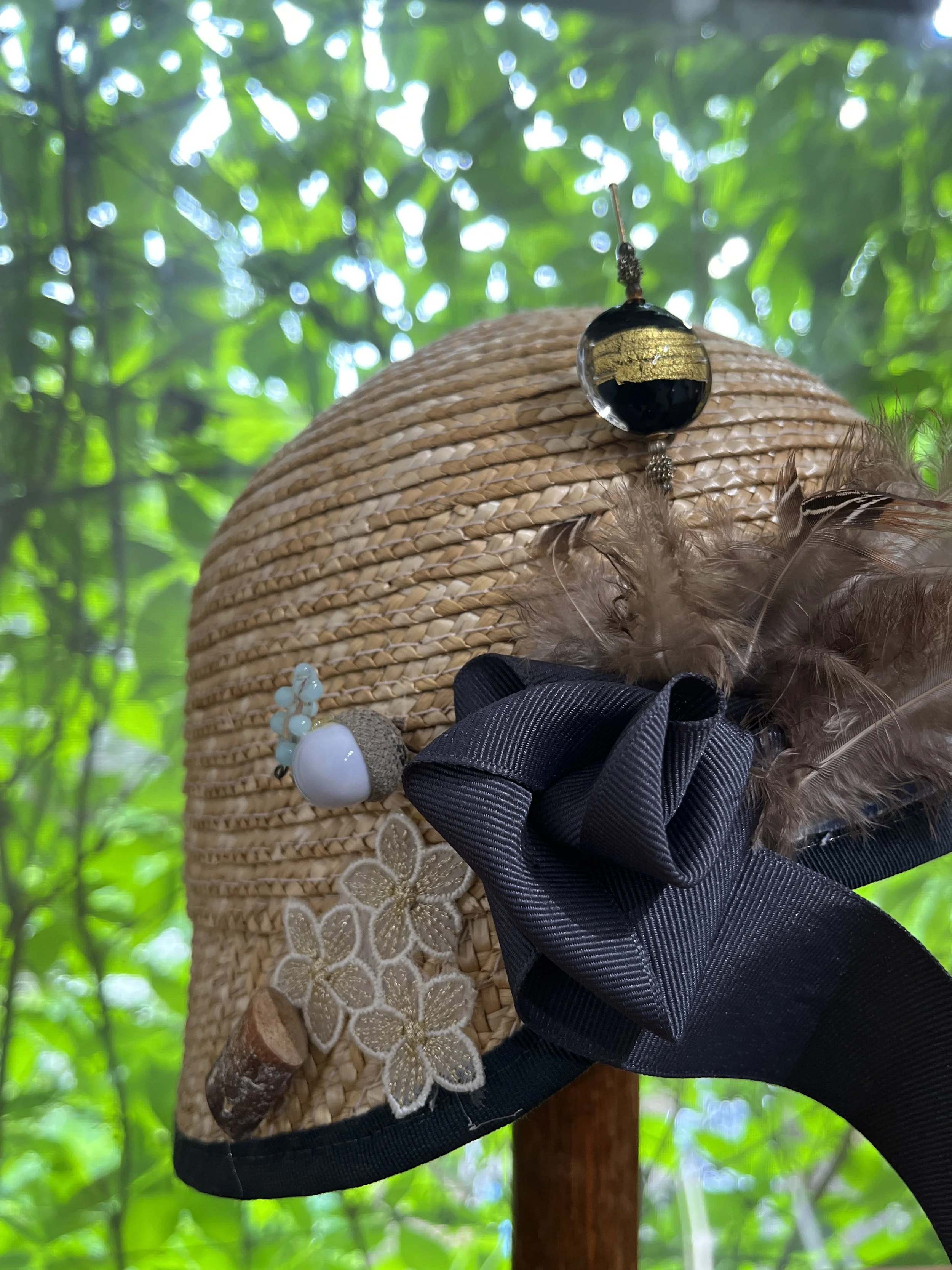 A feather from a necklace is this hat's inspiration. The peacock's feathers and golden wings dazzle and form a beautiful contrast. While he migrates south for the winter, he rests on a branch.
