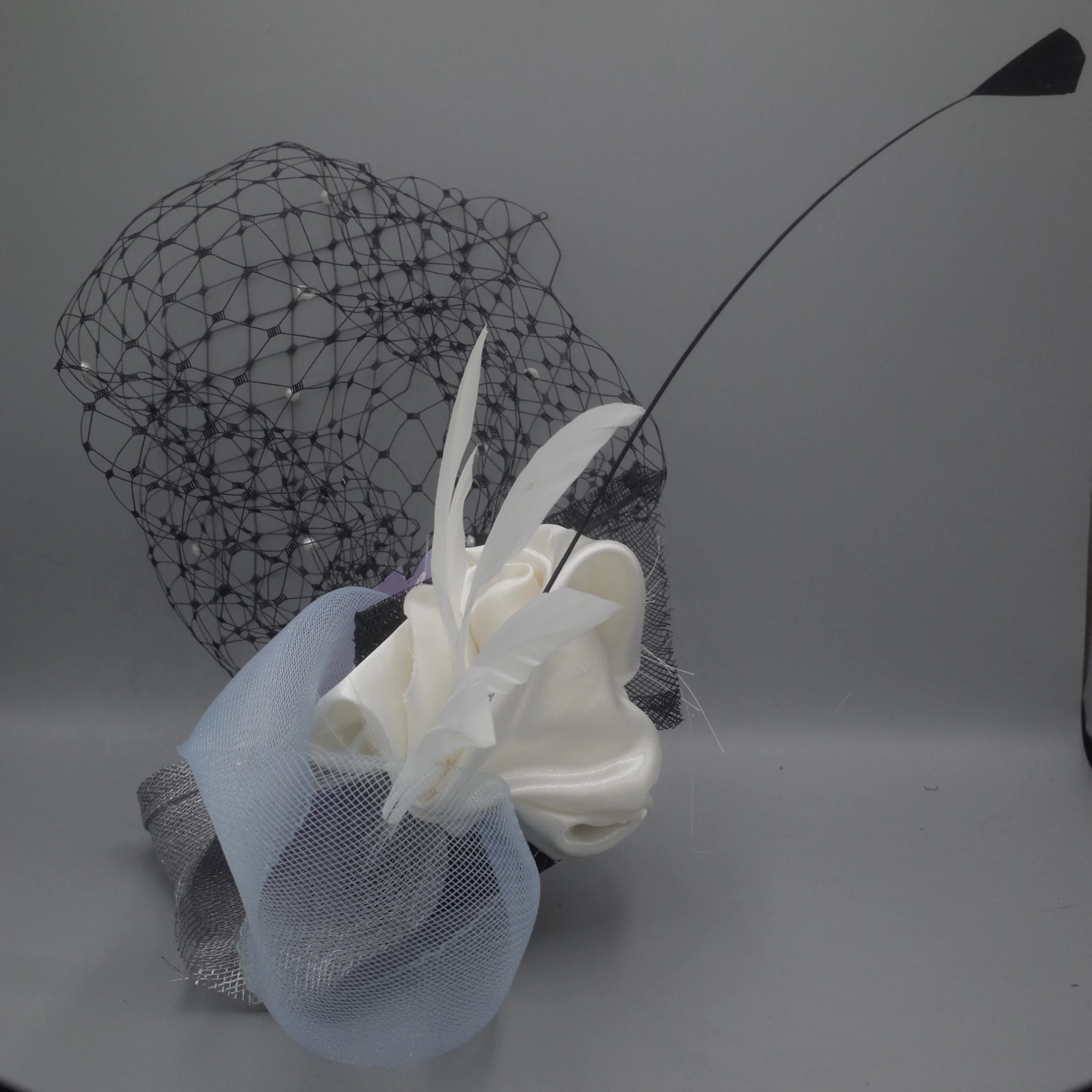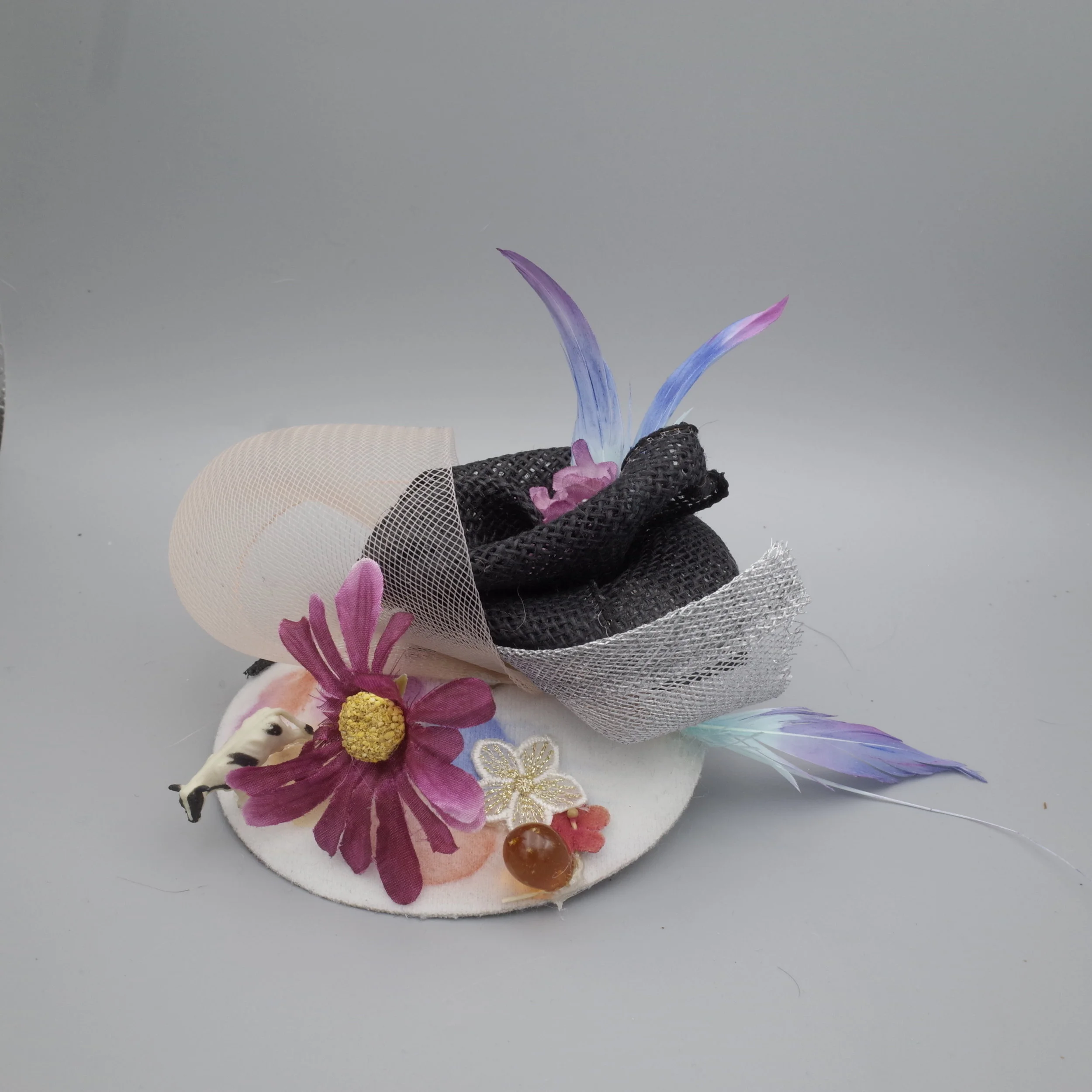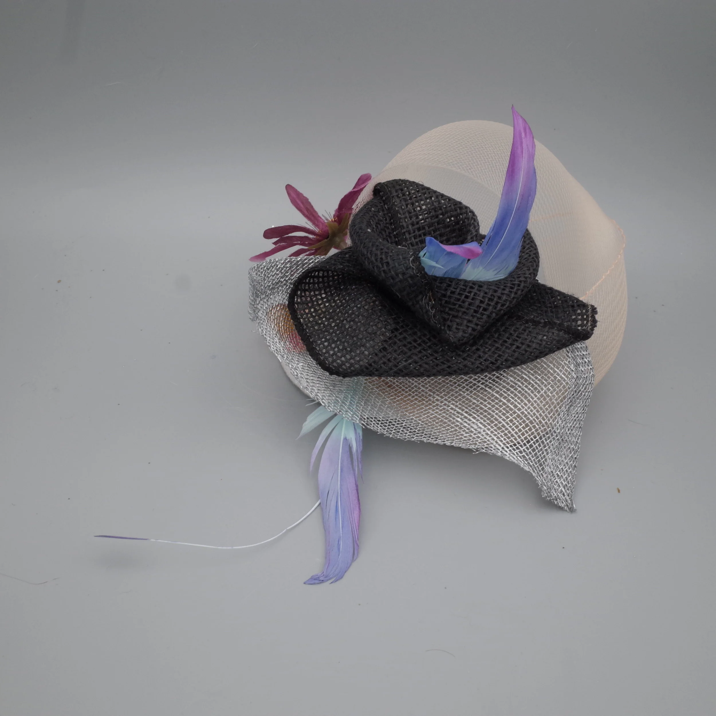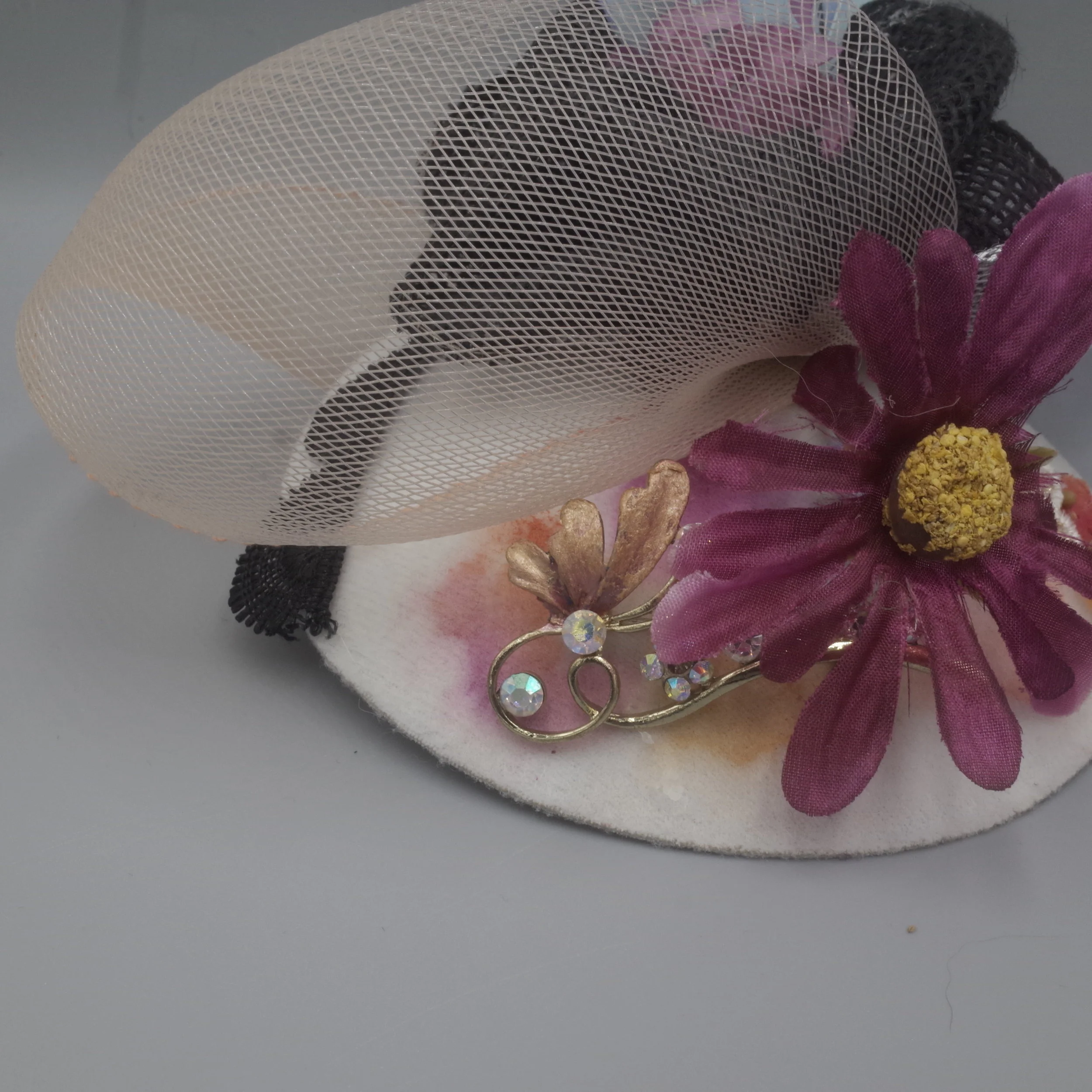 Bird Nest 鸟巢, 2017. Handpainted fascinator base; painted ostrich feather from London; silver sinamay trim from London; black sinamay trim from New York; vintage daisy from a second hand Iranian book store in Boston.