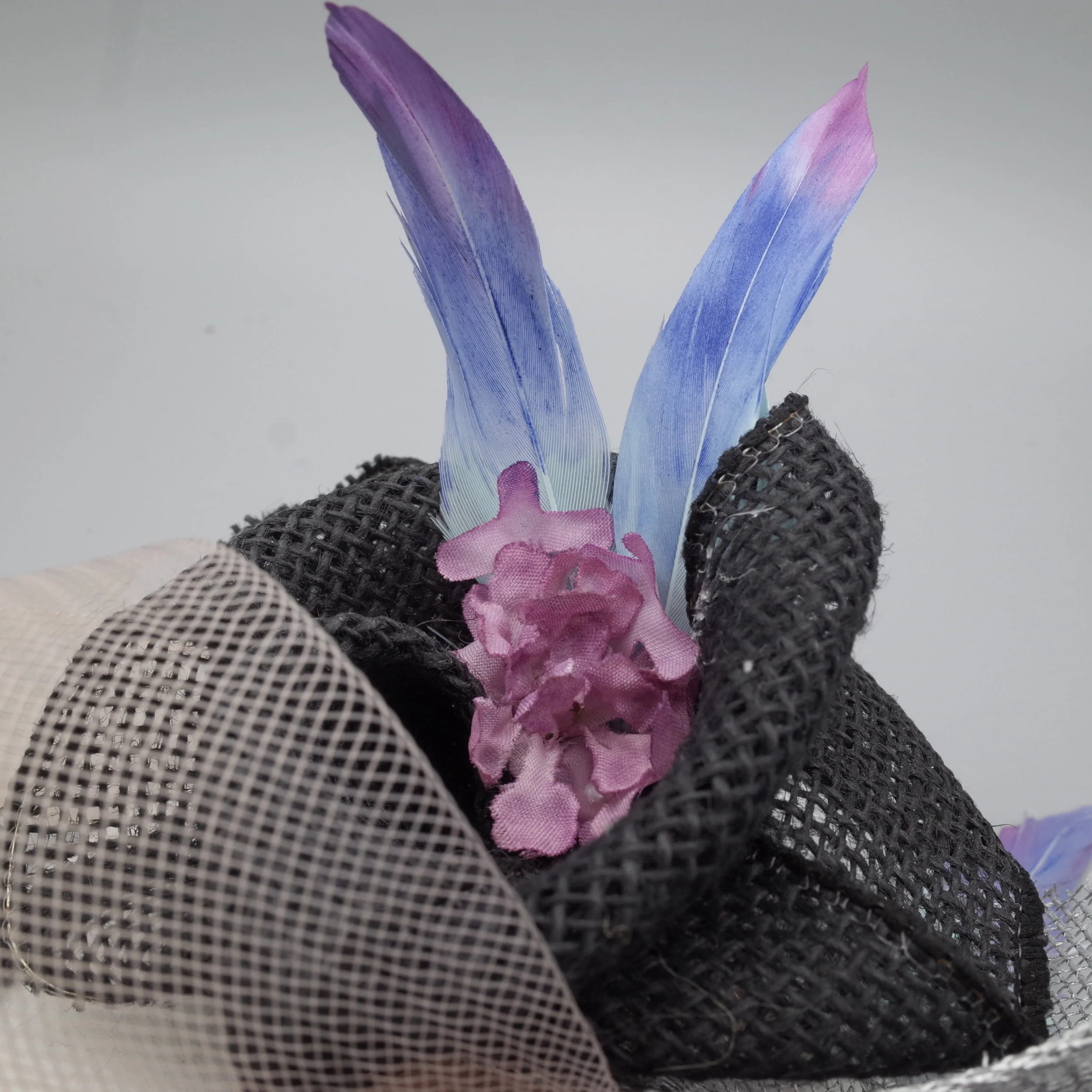 Peacock 孔雀, 2017. Black cutton teardrop fascinator base from Fujian; aqua crin from London; vintage peacock brooch from New York; black and white ostrich feather from London; purple silk ribbon from New York.