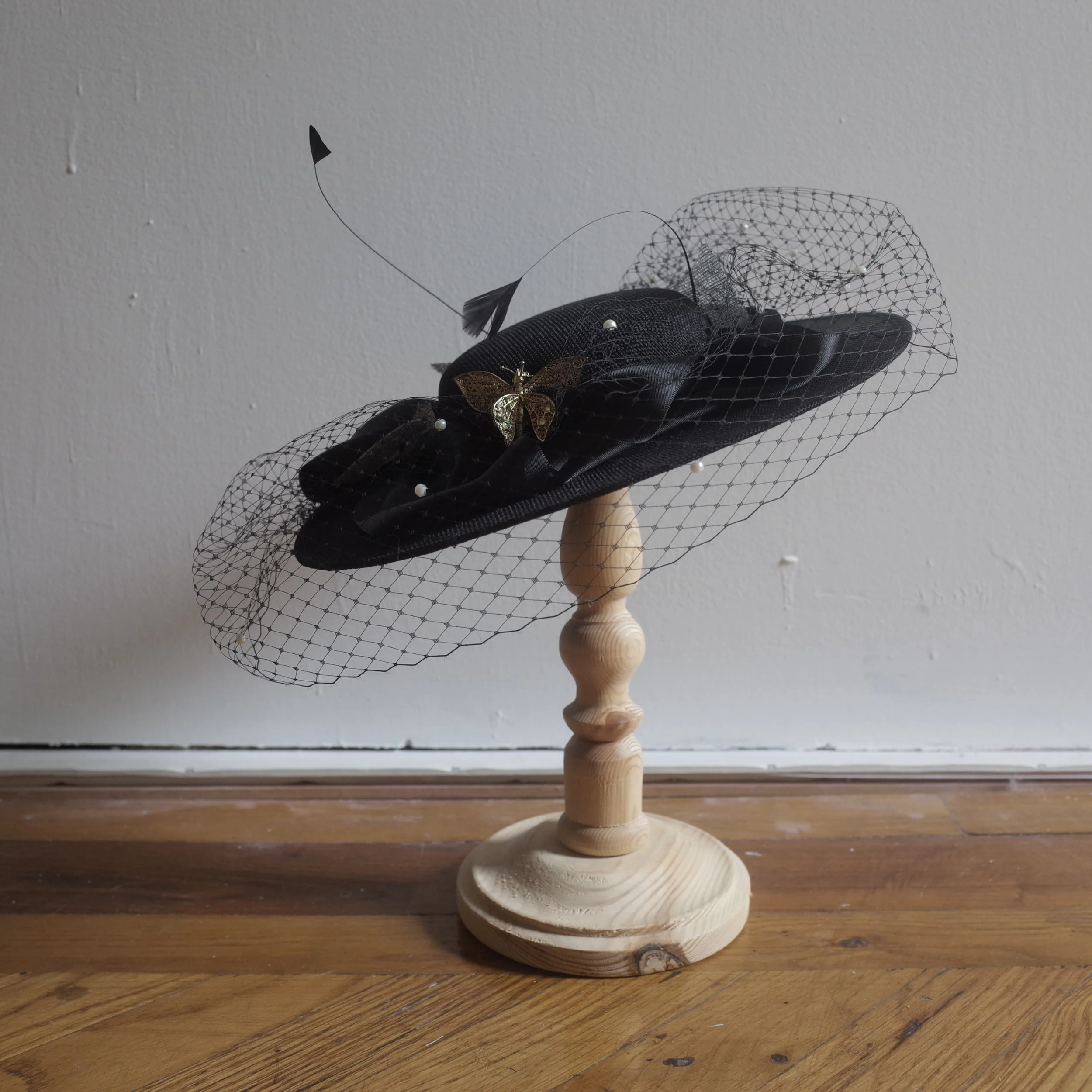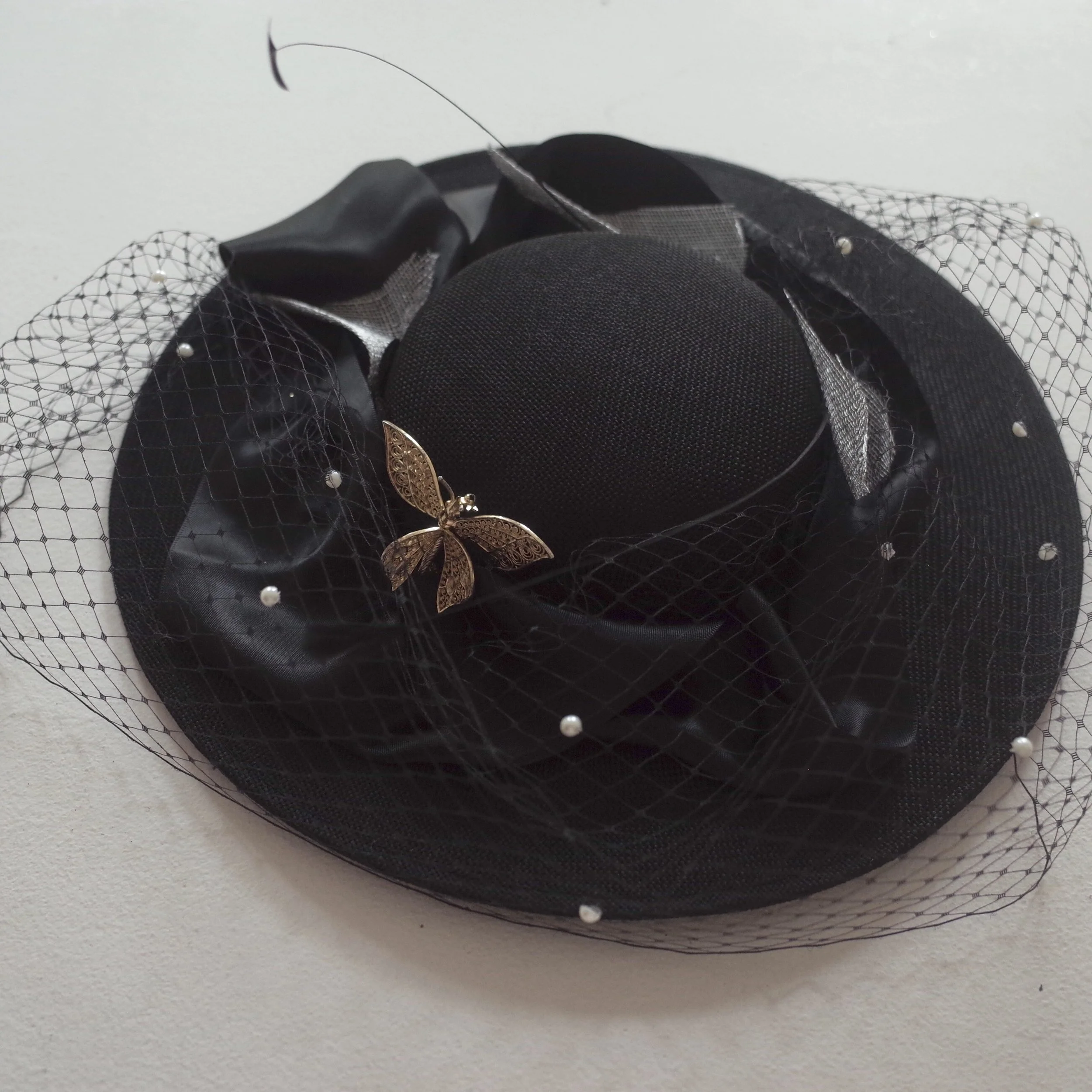 The Ring of Saturn 土星环, 2017. Black Saucer Hat Base Straw Fascinator from North Carolina; black silk ribbon from New York; black pearl veiling from North Carolina; silver sinamay cut from London; Black stripped Coque Feather from London.