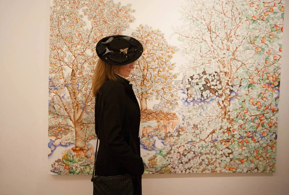 一枚镶钻的古董孔雀胸针是这顶礼帽的灵感来源。费里尼的电影Amarcord的结尾,一只孔雀从天而降,在白雪覆盖的小镇中徐徐开屏,这种日常以内但又绝不寻常的美成为所有人记忆深刻的片段。艺术大概是这样的集体记忆中沉淀下的段落。这顶礼帽为温哥华的阴晴小姐定制。