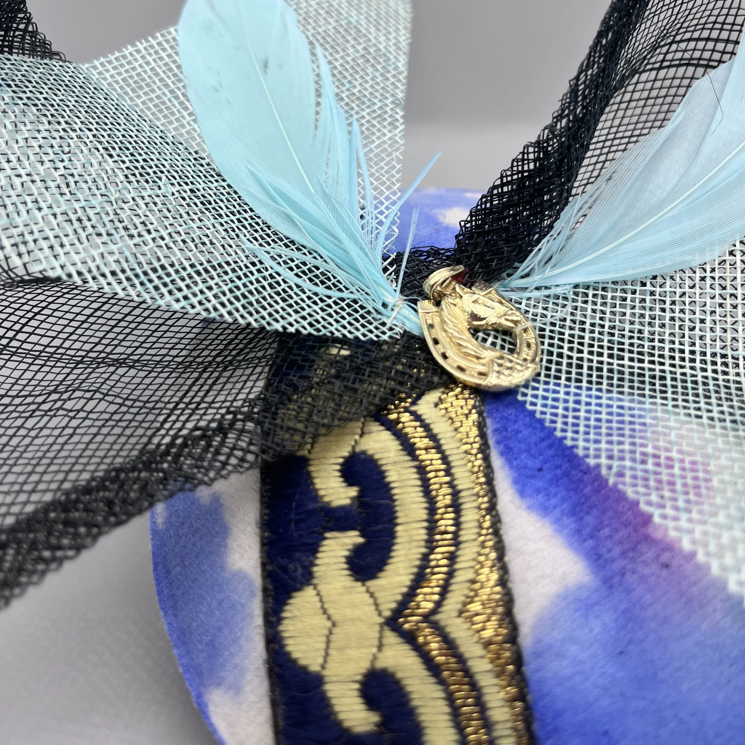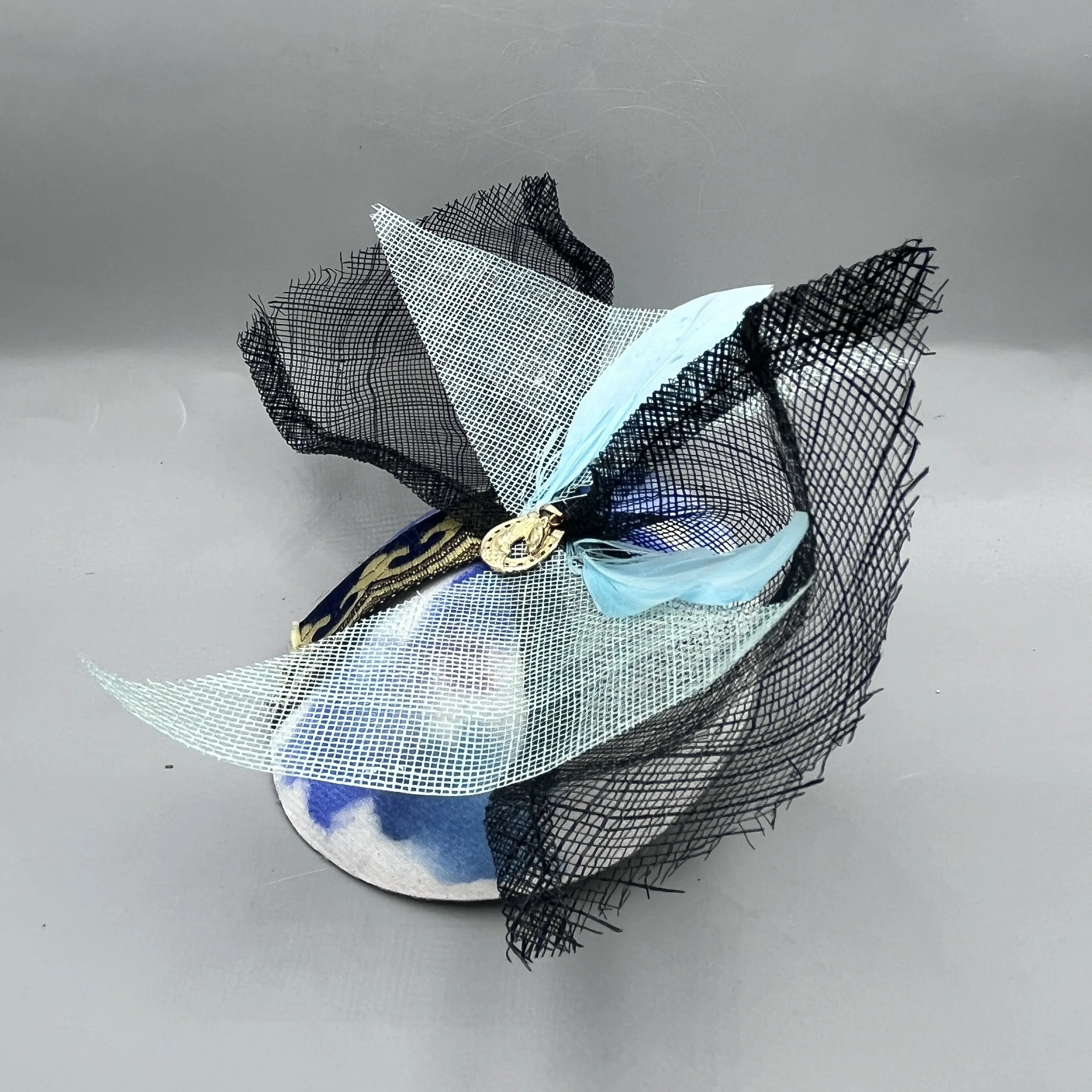Night Wing 夜翼, 2022. Hand painted teardrop fascinator base, wave fabric from New York, black and lagoon blue sinamay from New Jersey, a horse necklace pendant that travels with Liu Ying all these years.