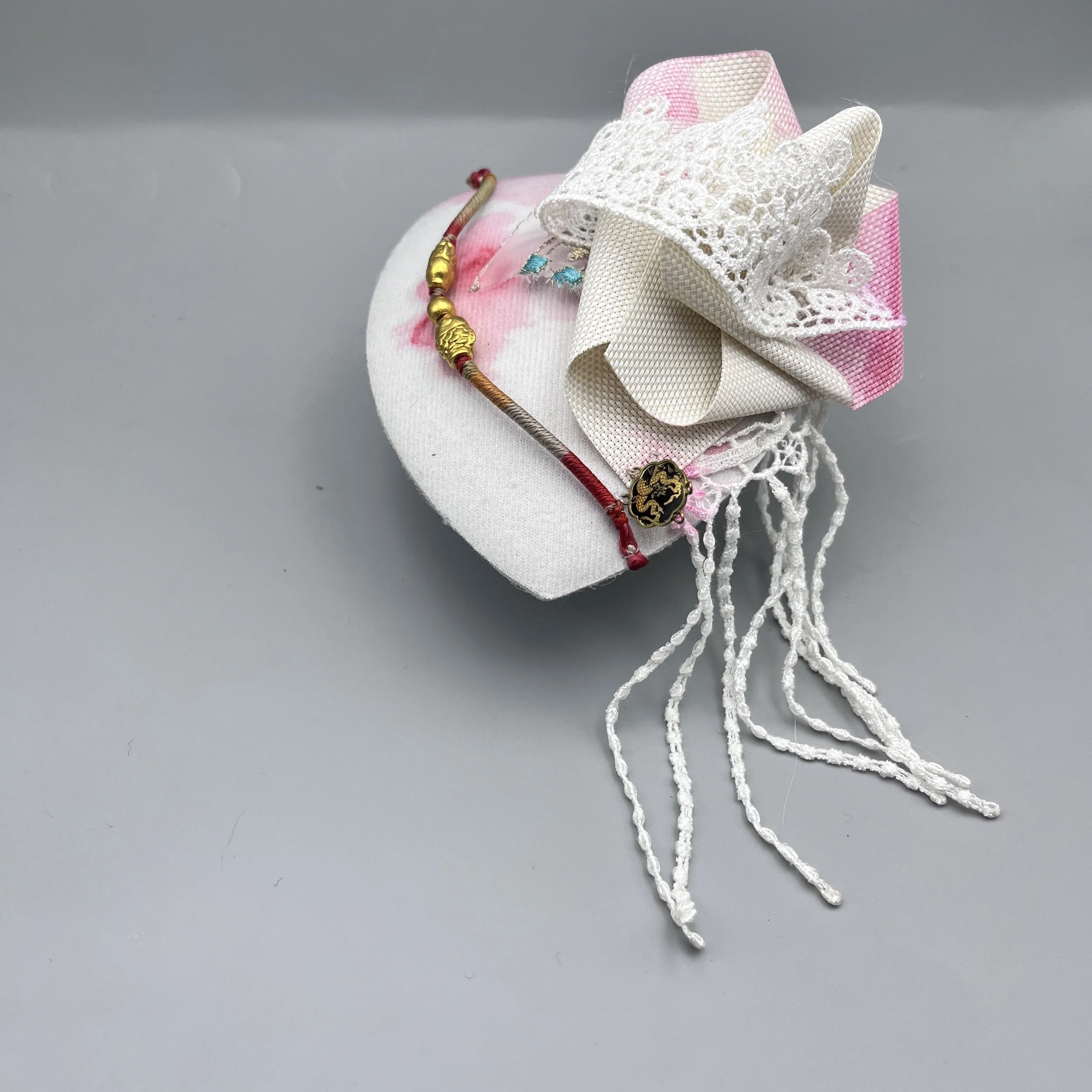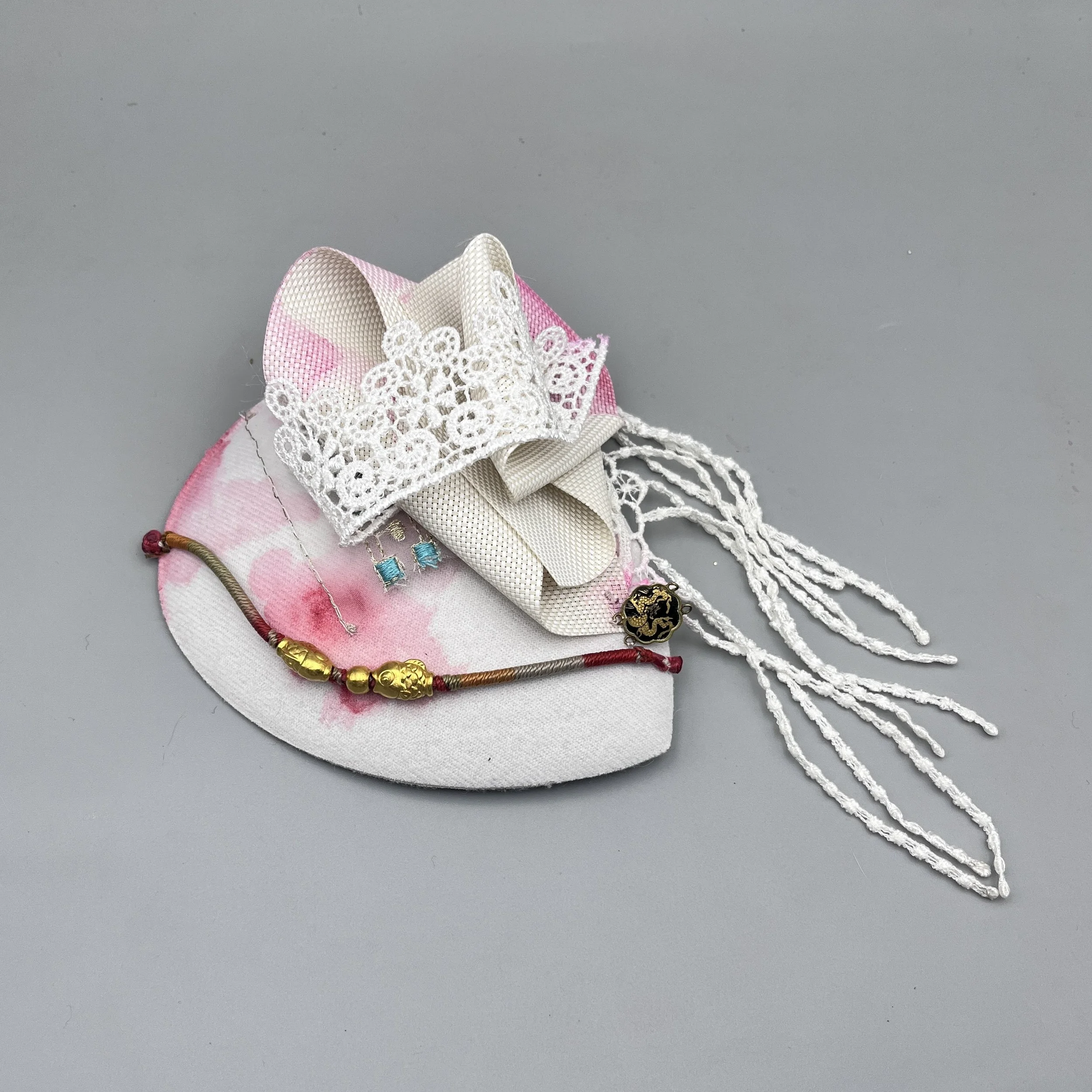 Peach Blossom Spring 桃花源, 2022. Hand Painted teardrop fascinator base, vintage white laces as a gift from Yoshie Sugito, lagoon blue fabric, window shade sample, a double fish hand bracelet that grows up with Zhiman all these years.