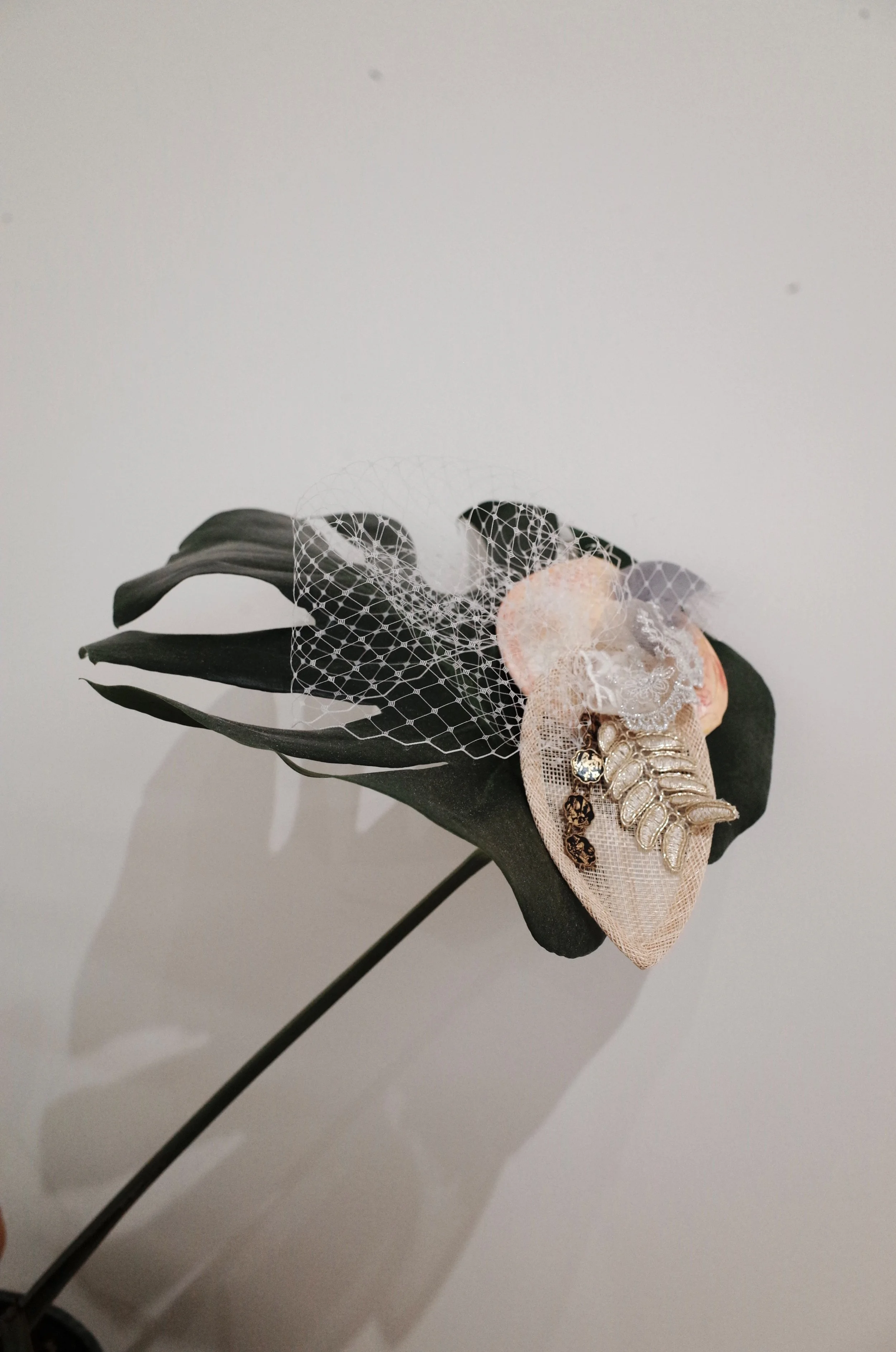 Wheat Field 麦田, 2025. Handpainted teardrop fascinator base, ivory veriling from North Carolina, vintage lace as a gift from Yoshie Sugito, vintage jewlery piece as a gift from Morgan O'Hara.